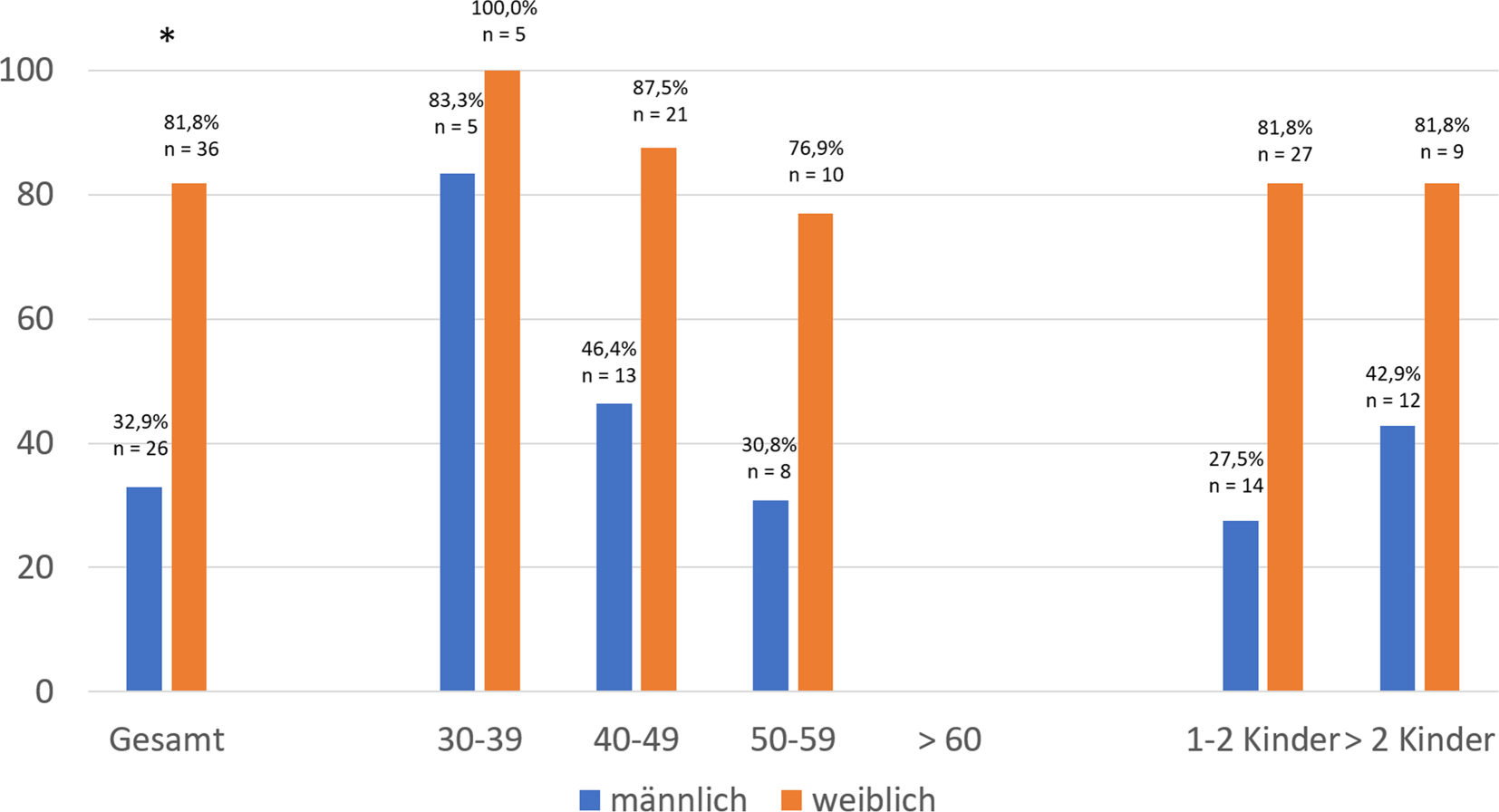 Elternzeit aufgrund der Kinder. Darstellung der Antworten auf die Frage „Haben Sie aufgrund der Kinder Elternzeit genommen?“ nach männlich (blau) und weiblich (orange) getrennt. x‑Achse: Antwort ja; y‑Achse: Anzahl der Antworten in Prozent. (Daten gesamt: χ2 = 27,040, df = 1, p<0,001), * p < 0,05