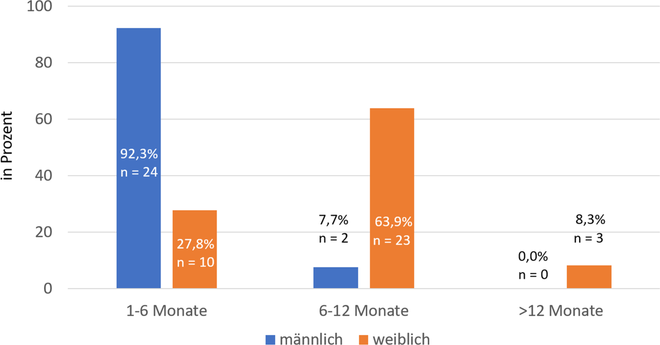 Durchschnittliche Elternzeitdauer pro Kind. Darstellung der Antworten auf die Frage „Wie lange haben Sie Elternzeit je Kind genommen?“ nach männlich (blau) und weiblich (orange) getrennt. x‑Achse: Antworten Elternzeitdauer im Durchschnitt pro Kind; y‑Achse: Anzahl der Antworten in Prozent. (χ2 = 37,968, df = 3, p<0,001)