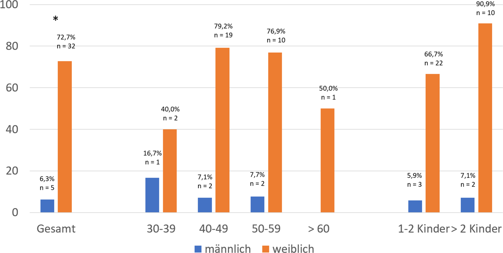Teilzeitarbeit aufgrund der Kinder. Darstellung der Antworten auf die Frage „Haben Sie aufgrund der Kinder Teilzeit gearbeitet oder arbeiten aufgrund der Kinder Teilzeit?“ nach männlich (blau) und weiblich (orange) getrennt. x‑Achse: Antwort ja; y‑Achse: Anzahl der Antworten in Prozent. (Daten gesamt: χ2 = 59,238, df = 1, p<0,001), * p < 0,05