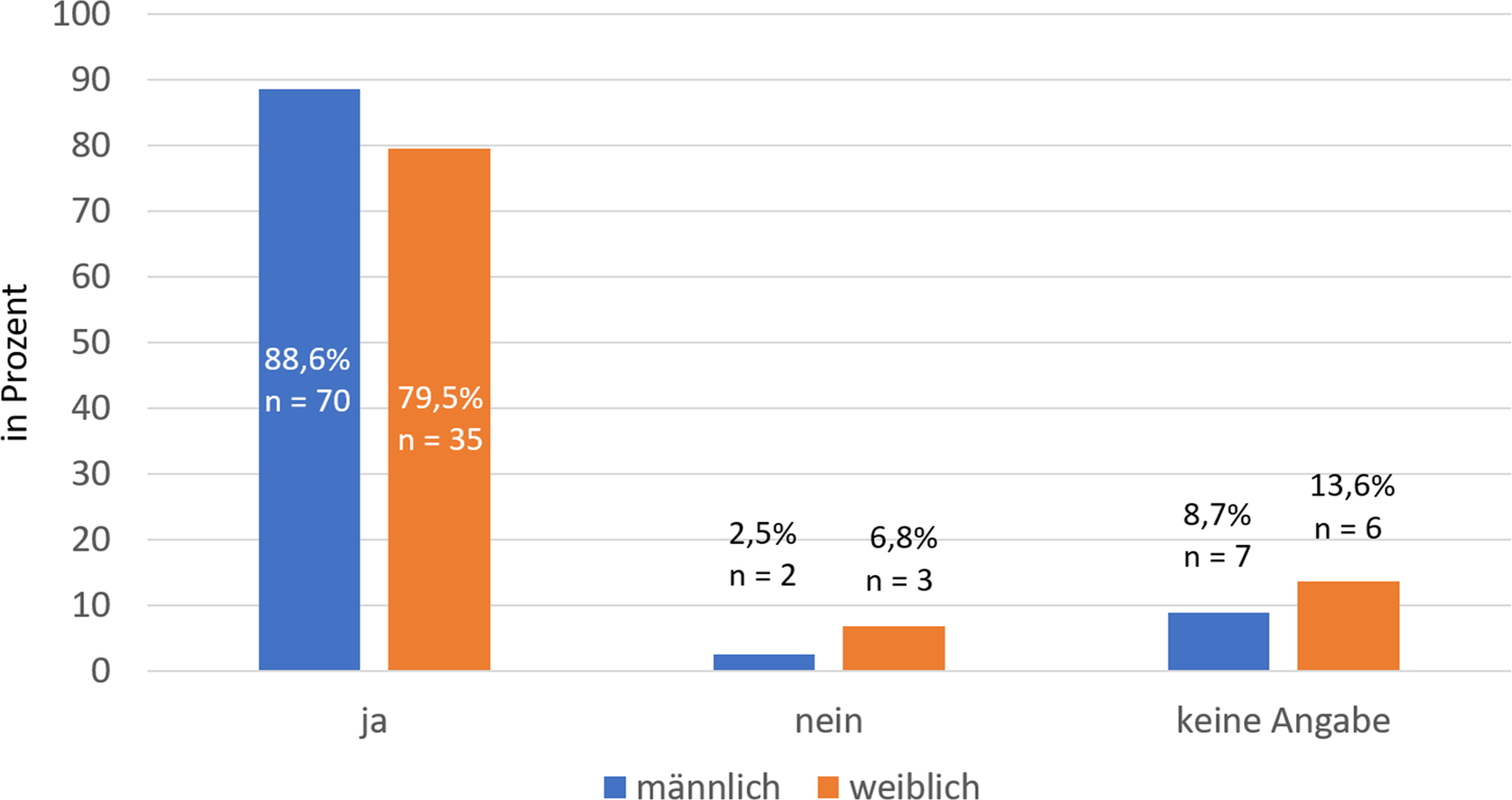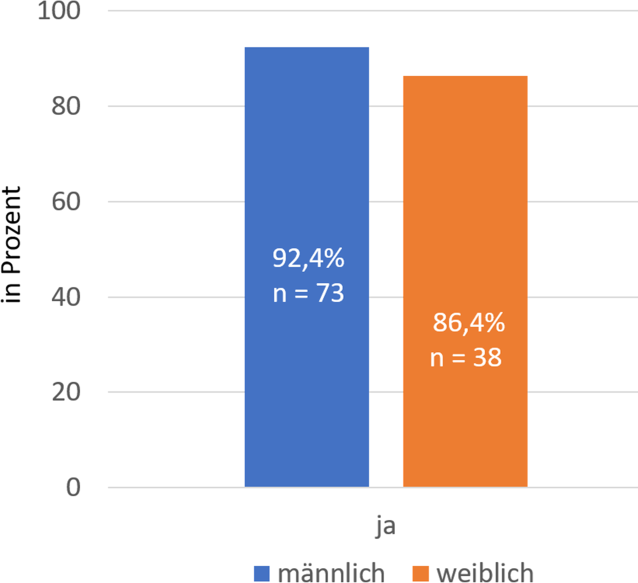 Geteilte Betreuung der Kinder. Darstellung der Antworten auf die Frage „Teilen bzw. teilten Sie sich die Betreuung der in Ihrem Haushalt lebenden Kinder mit jemanden?“ nach männlich (blau) und weiblich (orange) getrennt. x‑Achse: Antwort ja; y‑Achse: Anzahl der Antworten in Prozent. (χ2 = 1,172, df = 1, p = 0,279)