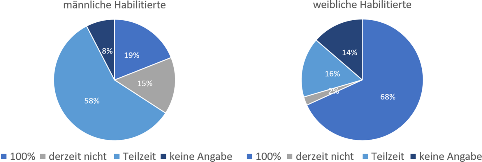 Habilitierte Frauen mit Kindern haben deutlich häufiger und länger Elternzeit genommen als ihre männlichen Kollegen. Hier beträgt der Unterschied bezüglich der Häufigkeit annähernd 50 %. Zusätzlich zu der Elternzeit haben Frauen deutlich häufiger in Teilzeit gearbeitet. Der Unterschied liegt hier bei 65 % im Vergleich zu den männlichen Kollegen. Habilitierte Frauen reduzieren im Vergleich zu ihren männlichen Kollegen ihre Arbeitszeit somit häufiger temporär aufgrund der Kinderbetreuung und verlassen dadurch den geradlinigen Karriereweg. Tendenziell zeigte sich in der Altersgruppe von 30 bis 39 eine Änderung mit Zunahme des prozentualen Anteils an habilitierten Männern, die sowohl Elternzeit nehmen als auch Teilzeit arbeiten.