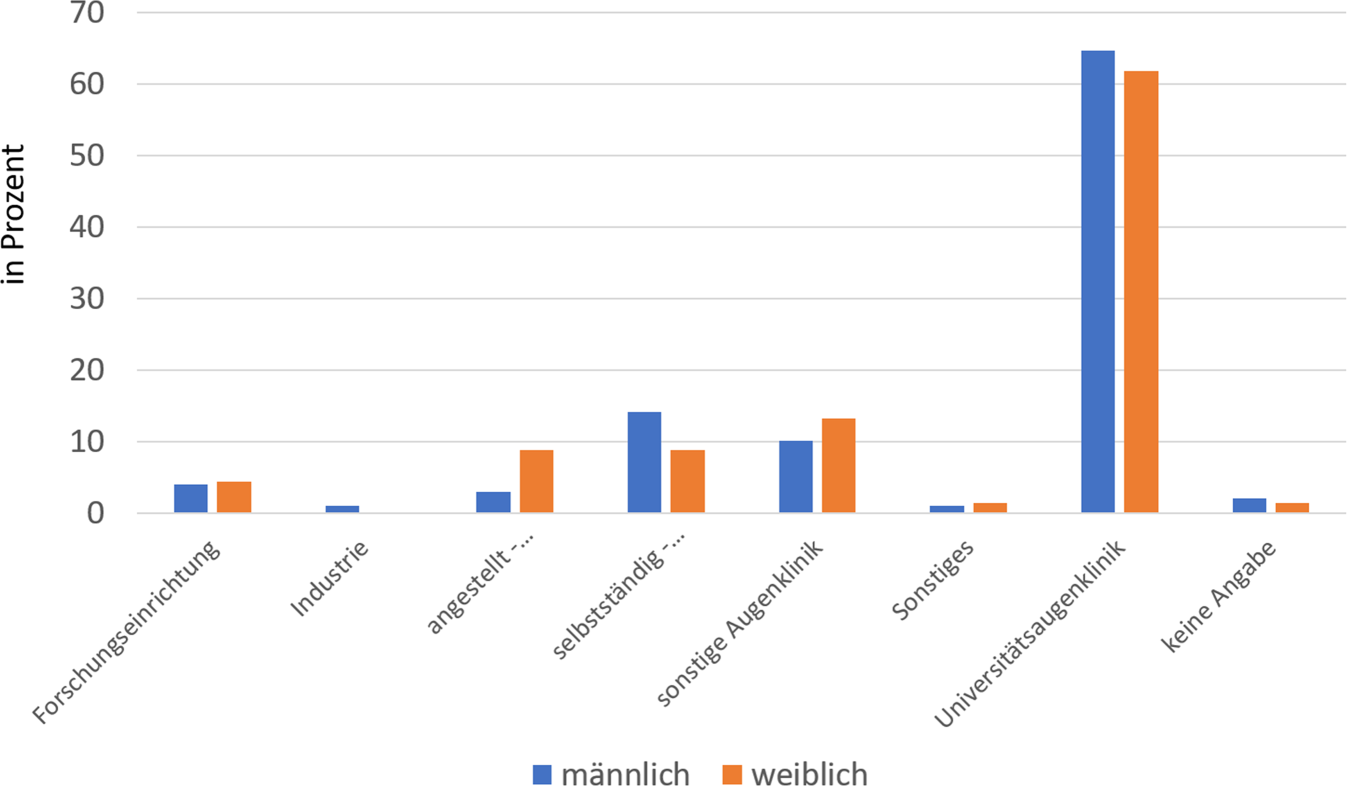 Derzeit sind 64,6 % der habilitierten Ophthalmologen und 61,8 % der habilitierten Ophthalmologinnen an einer Universitätsaugenklinik tätig (χ2 = 4,702, df = 7, p = 0,696) (Abb. 8). Bezüglich der Tätigkeit in einer Forschungseinrichtung (♂: 4,0 %, ♀: 4,4 %), in der Industrie (♂: 1,0 %, ♀: 0 %), sonstige Augenkliniken (♂: 10,1 %, ♀: 13,2 %) und Sonstiges (♂: 1,0 %, ♀: 1,5 %) zeigten sich keine signifikanten geschlechtsspezifischen Unterschiede (Abb. 8). Im Angestelltenverhältnis in einer Niederlassung/Praxis/MVZ/Praxisgemeinschaft waren prozentual mehr Frauen als Männer tätig (♂: 3,0 %, ♀: 8,8 %). Umgekehrt war der Anteil der Selbstständigen in diesen Einrichtungen bei Männern höher als bei Frauen (♂: 14,1 %, ♀: 8,8 %) (Abb. 8).