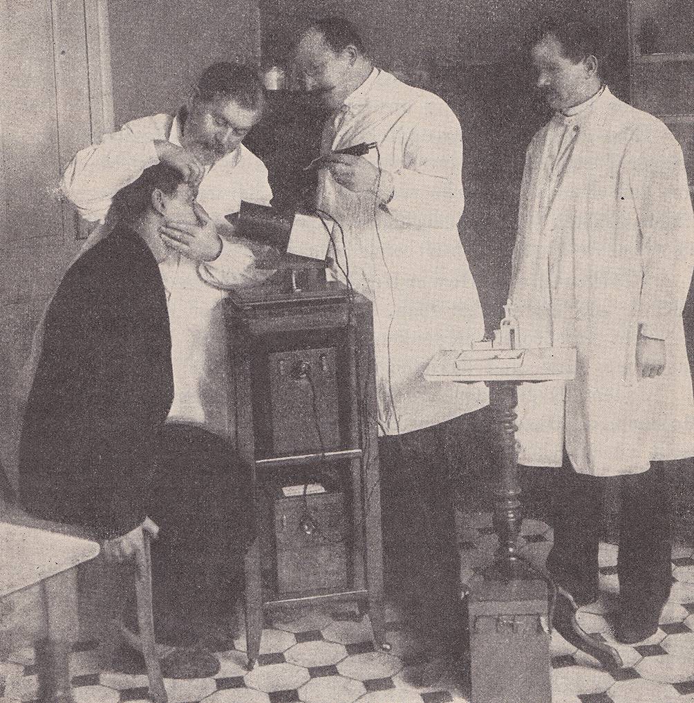 Julius Hirschberg, an einer Patientin stehend und deren Lider öffnend, mit Assistenten bei einer Magnetextraktion. Der Assistent in der Mitte hält den von Julius Hirschberg entwickelten und ab 1879 eingesetzten (kleineren) Handmagneten. Auf dem Tisch steht ein größerer Magnet. (Aus [34])