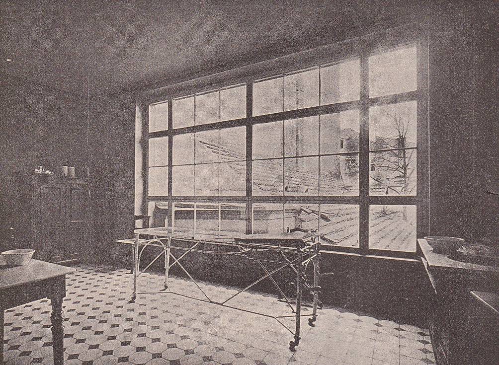 Der Operationssaal (Abb. 5) lag nach Norden ausgerichtet und war von den ambulanten Untersuchungszimmern getrennt. Hirschberg schrieb: „Jede Augenheilanstalt braucht ein eignes Operationszimmer. Ich war einer der ersten, der ein solches nach den neuen Grundsätzen errichtet hat“ [32]. Mit den „neuen Grundsätzen“ war die Berücksichtigung der Antisepsis nach Joseph Lister (1827–1912) mit möglichst weitgehender Keimreduktion im Operationssaal, bei Patient, Operateur und Hilfspersonal sowie bei Geräten und Verbandmaterial gemeint.