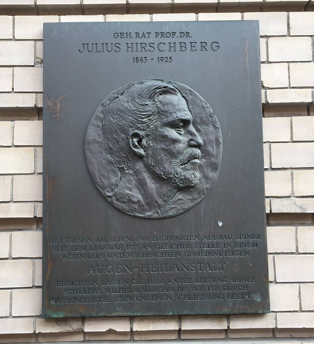 Nachdem sich Julius Hirschberg 1907 aus seiner Augenklinik in seine neue Wohnung am Berliner Schiffbauerdamm 26 zurückgezogen hatte, um sich ganz der Fertigstellung seiner „Geschichte der Augenheilkunde“ zu widmen, übernahm Wilhelm Mühsam die Leitung der 1908 an gleicher Stelle neu errichteten Klinik. Diese wurde 1936 aufgrund der Rassengesetzgebung zwangsweise geschlossen. Heute erinnert am Haus der ehemaligen Augenklinik in der Berliner Reinhardtstraße 34 eine Plakette an Julius Hirschberg, Wilhelm Mühsam und die zwangsweise Schließung der Augenheilanstalt (Abb. 6). Am ersten Stockwerk ist ein Relief Albrecht von Graefes angebracht.