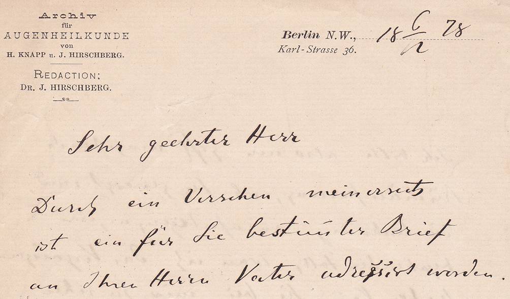 Kopf eines Briefes von 1878 mit Adresse der Hirschberg-Klinik. Der Brief belegt, dass Hirschberg neben Hermann Knapp an der Herausgabe des Archivs für Augenheilkunde (Knapp-Schweigger-Hess) beteiligt war. Knapp war 1869 nach New York ausgewandert. Er begründete dort die „Archives of Ophthalmology“. Hirschberg besuchte seinen Freund Knapp auf seinen USA-Reisen. (Archiv JMR)