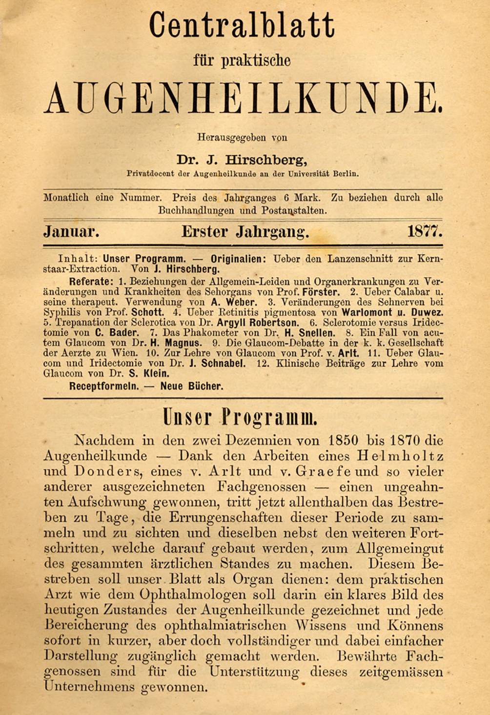 Von 1878 bis 1881 zeichnete Hirschberg mit seinem Freund Hermann Knapp (1832–1911) für das „Archiv für Augenheilkunde“ (Knapp-Schweigger-Hess) verantwortlich (Abb. 7). Eine bedeutsame Gründung war das „Centralblatt für praktische Augenheilkunde“, das er ab 1877 bis 1919 bei Veit & Comp. (Compagnie) herausgab. Wesentliche Intention des „Centralblatts“ war, „dem praktischen Arzt wie dem Ophthalmologen soll darin ein klares Bild des heutigen Zustandes der Augenheilkunde gezeichnet und jede Bereicherung des ophthalmiatrischen Wissens und Könnens sofort in kurzer, aber doch vollständiger und dabei einfacher Darstellung zugänglich gemacht werden“ (Abb. 8).