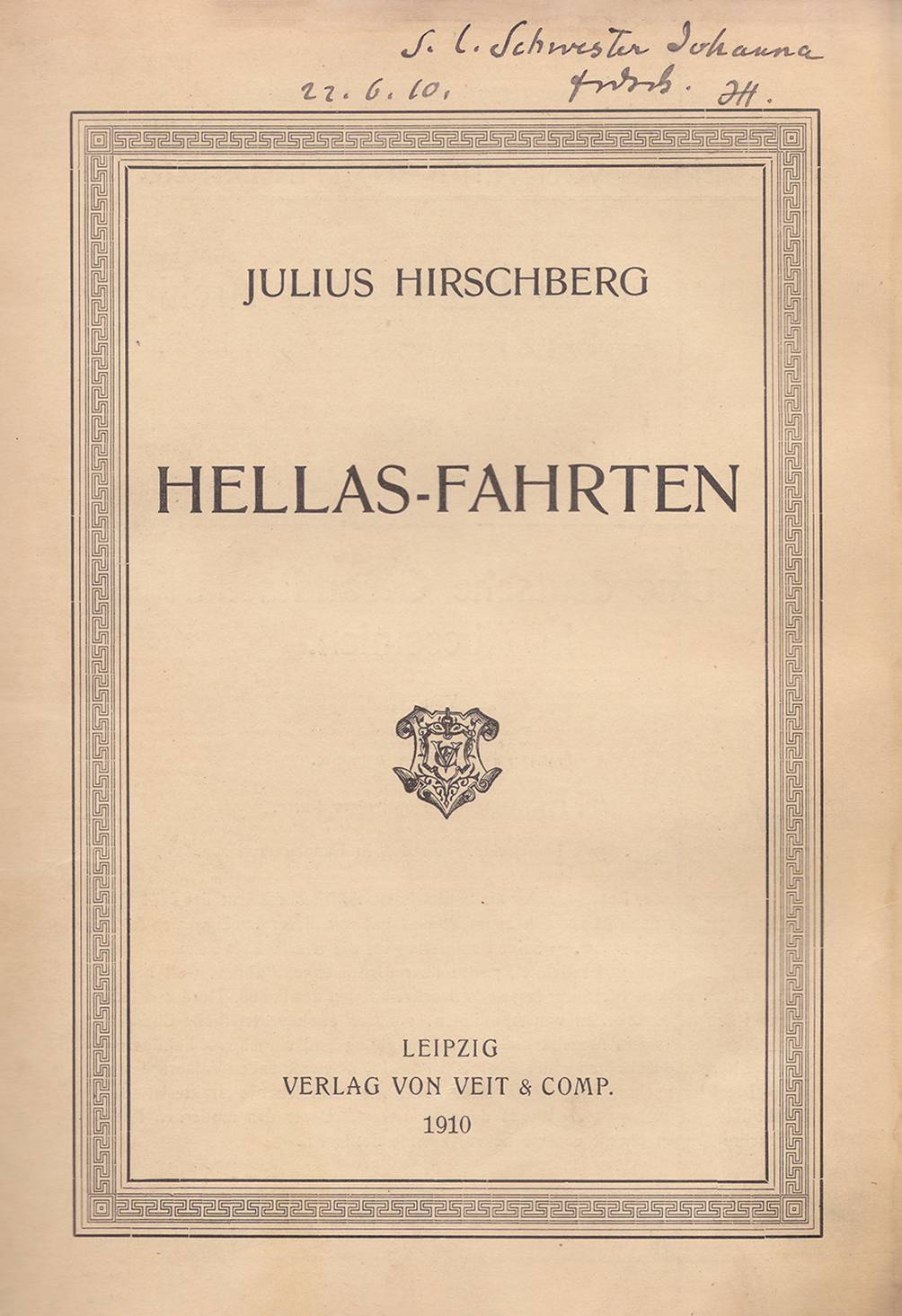 Titelblatt der „Hellas-Fahrten“ [12] mit persönlicher Widmung Hirschbergs an seine Schwester Johanna, 1910. (Archiv JMR)
