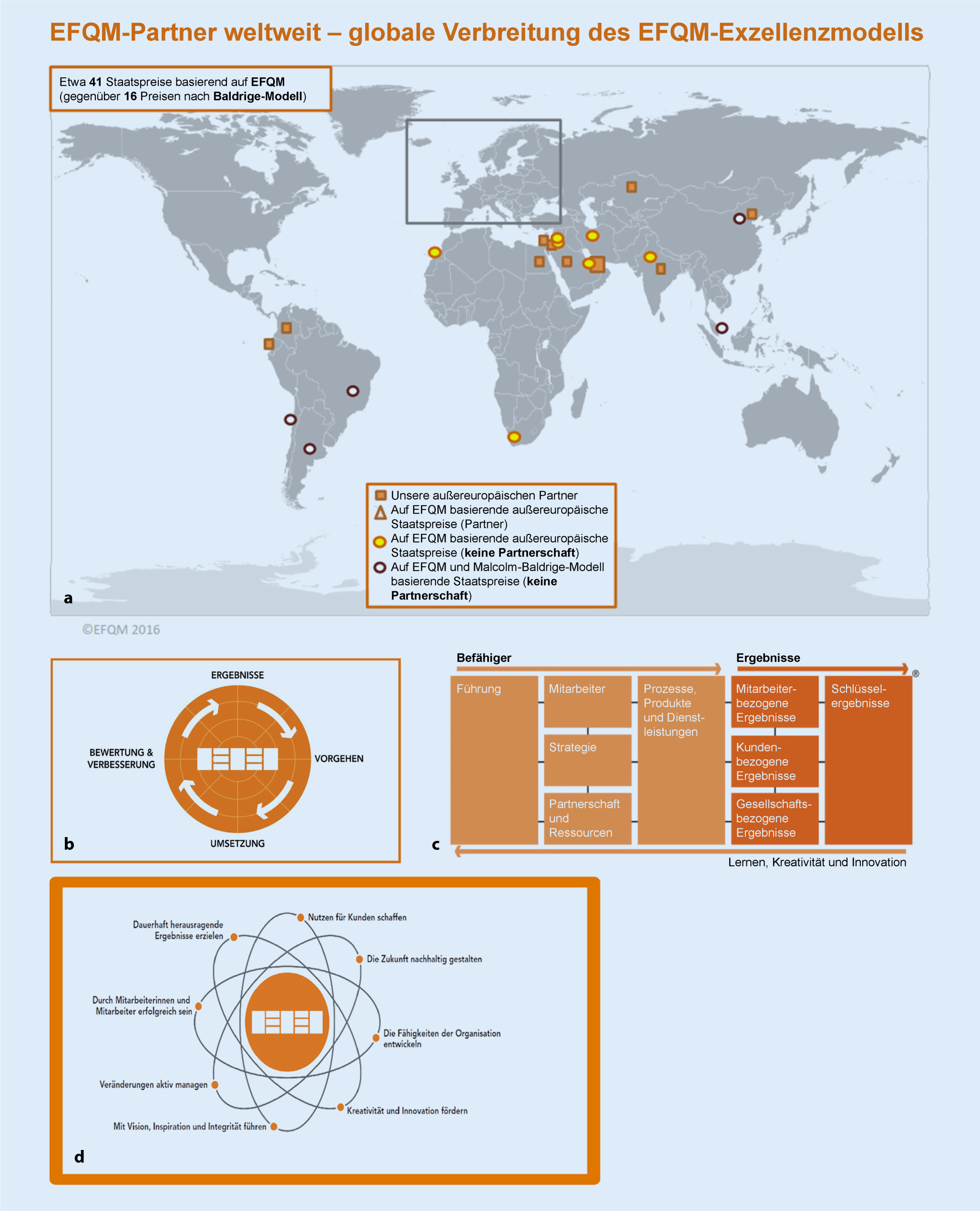Weltweite Verbreitung des EFQM-Modells (a). b RADAR-Logik. c Die 9 Hauptkriterien des EFQM-Modells. d Grundkonzepte des EFQM-Modells (Version 2013)