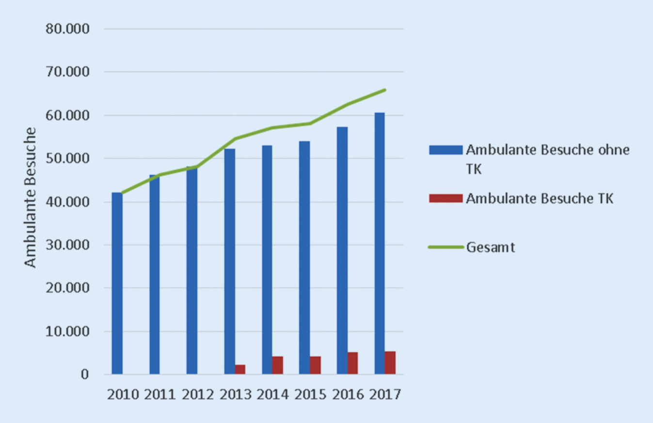 Steigerung der ambulanten Besuche (2010–2017) ohne Tageschirurgie (blau), ambulante tageschirurgische Patient*innen (rot)