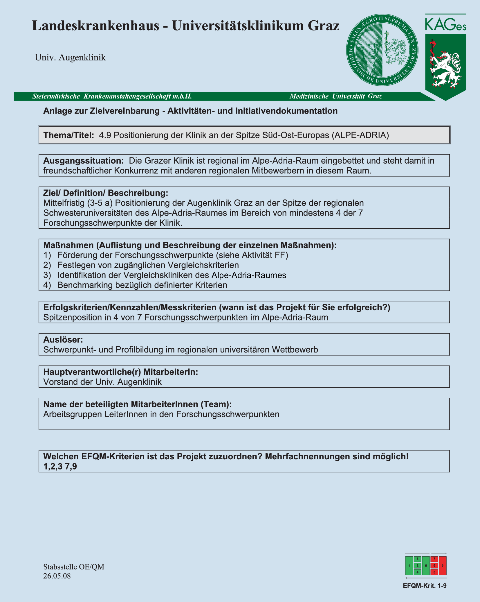Die Universitäts-Augenklinik hat mit einem erfolgreichen Projekt im Rahmen ihres Committed to Excellence(C2E)-Preises 2008 gezeigt, dass eine gemeinsame, abgestimmte Zielvereinbarung zwischen KAGes, Med Uni Graz und einer ihrer Organisationseinheiten, namentlich der Universitäts-Augenklinik, in einem sehr engen, durch das EFQM C2E-Assessment vorgegebenen Zeitrahmen bereits 2008 innerhalb von 6 Monaten umgesetzt werden konnte.