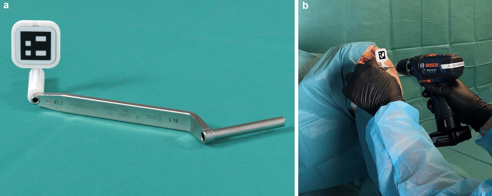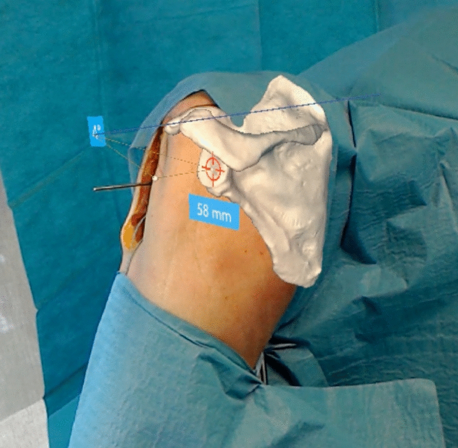 The scapula position was registered using a custom-made fiducial marker and stereo-tracking, as described before [15] (Fig. 1). First, the rough orientation was defined through the location of the acromion, coracoid, and glenoid. Those points were defined in the preoperative planning using our institution’s software (CASPA). Second, the fine adjustment was achieved by tracing the glenoids’ surface. The exact location of the hologram was then calculated and superimposed as augmented reality to the operative site. After confirming the optimal position, the navigation process was started (Fig. 2, Video 1). A virtual model of the scapula appeared in the surgeon’s field of vision. The drill sleeve with a fiducial marker was used to display the planned entry point with deviation in millimeters and the planned vector with deviation in degree (Fig. 3). With this information, the target wire could be placed (Fig. 4).