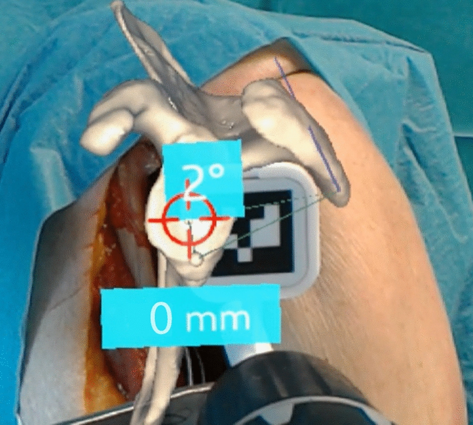 Computer-assisted pose tracking navigation or patient-specific instrumentation can be utilized to achieve the planned baseplate position. Both systems offer promising results but have a couple of disadvantages. Navigation systems are expensive to purchase and can be uncomfortable to use, potentially increasing surgical time. Patient-specific guides require a particular time of preoperative manufacturing and intraoperative specific handling [8, 9]. Recently, the technology of augmented reality (AR) through a head-mounted display (HMD) has been introduced [10]. This technology seems easy to use and comparably cheap without the disadvantage of long preoperative preparation time. The current literature on this topic is very sparse, especially regarding shoulder surgery. Berhouet et al. [11] described the 3D projection of a hologram of a reconstructed scapula. Gregory et al. [12] presented the intraoperative projection in one case. Both did not utilize the HMD for navigation but could prove the high potential of AR in RSA surgery. In a previous study, we analyzed the feasibility of HMD in ten 3D-printed bone models and found a mean deviation from the entry point of 2.26 mm ± 1.11 mm. The deviation from the planned vector was 2.74° ± 1.25° [13].