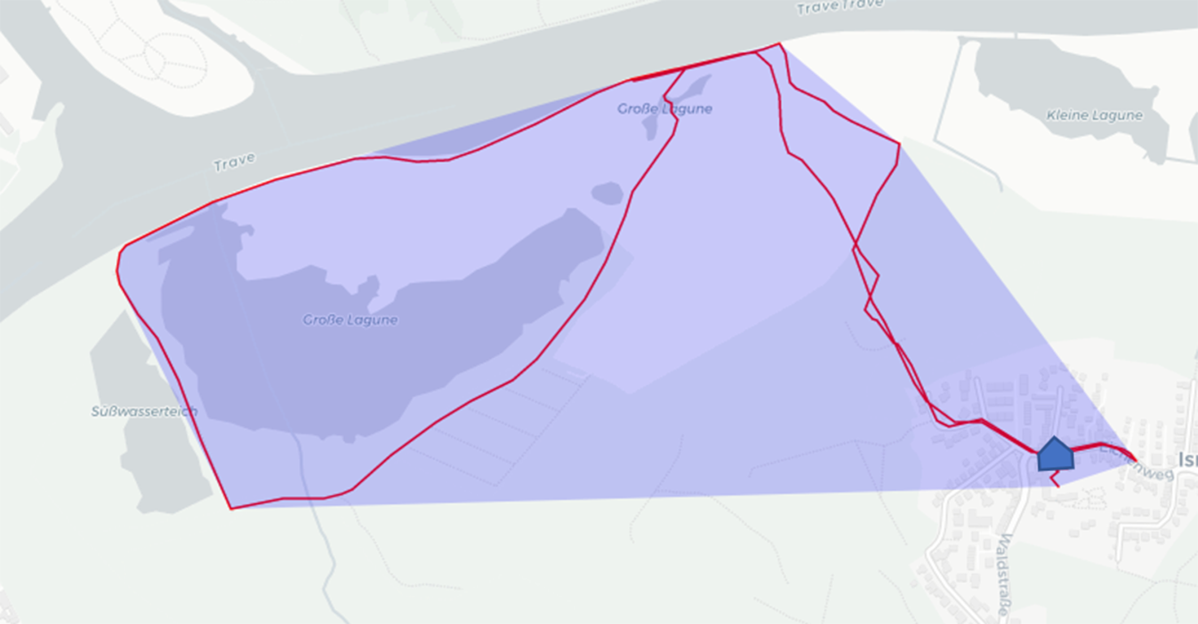 Veranschaulichung der GPS-Variable CHull (konvexe Hülle) als Darstellung der räumlichen Facette der außerhäuslichen Mobilität. Der blau markierte Bereich zeigt die CHull eines Tages (Quelle: eigene Abbildung)