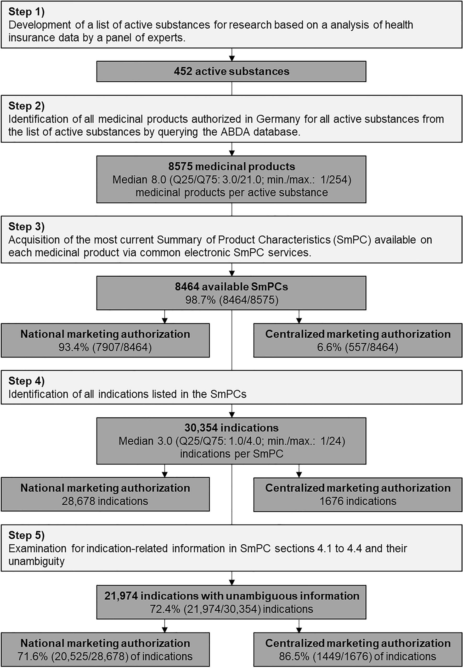We identified all medicinal products on the German market at the time of the investigation that contain the previously defined active substances using the ABDA database (ABDATA, Pharma-Daten-Service; Eschborn, Germany). The ABDA database offers comprehensive information and facts on medicinal products in Germany, including current SmPCs. The database is updated every 14 days to ensure accuracy. The corresponding SmPCs were searched both in the ABDA database and, if not available there, in the following databases: PharmNet.Bund Arzneimittel-Informationssystem (Federal Institute for Drugs and Medical Devices; Cologne, Germany, and Paul Ehrlich Institut; Langen, Germany), online database of the EMA (European Medicines Agency; Amsterdam, The Netherlands), Gelbe Liste Online (Vidal MMI Germany GmbH; Langen, Germany), Fachinfo-Service (Rote Liste Service GmbH; Frankfurt/Main, Germany). If none of the databases contained a respective SmPC, we attempted to obtain the SmPC directly from the marketing authorization holder. We used the definition of “medicinal product” according to Article 1 of Directive 2001/83/EC [19], which is also referred to in the EMA Guideline on the pharmaceutical development of medicines for pediatric use [20].