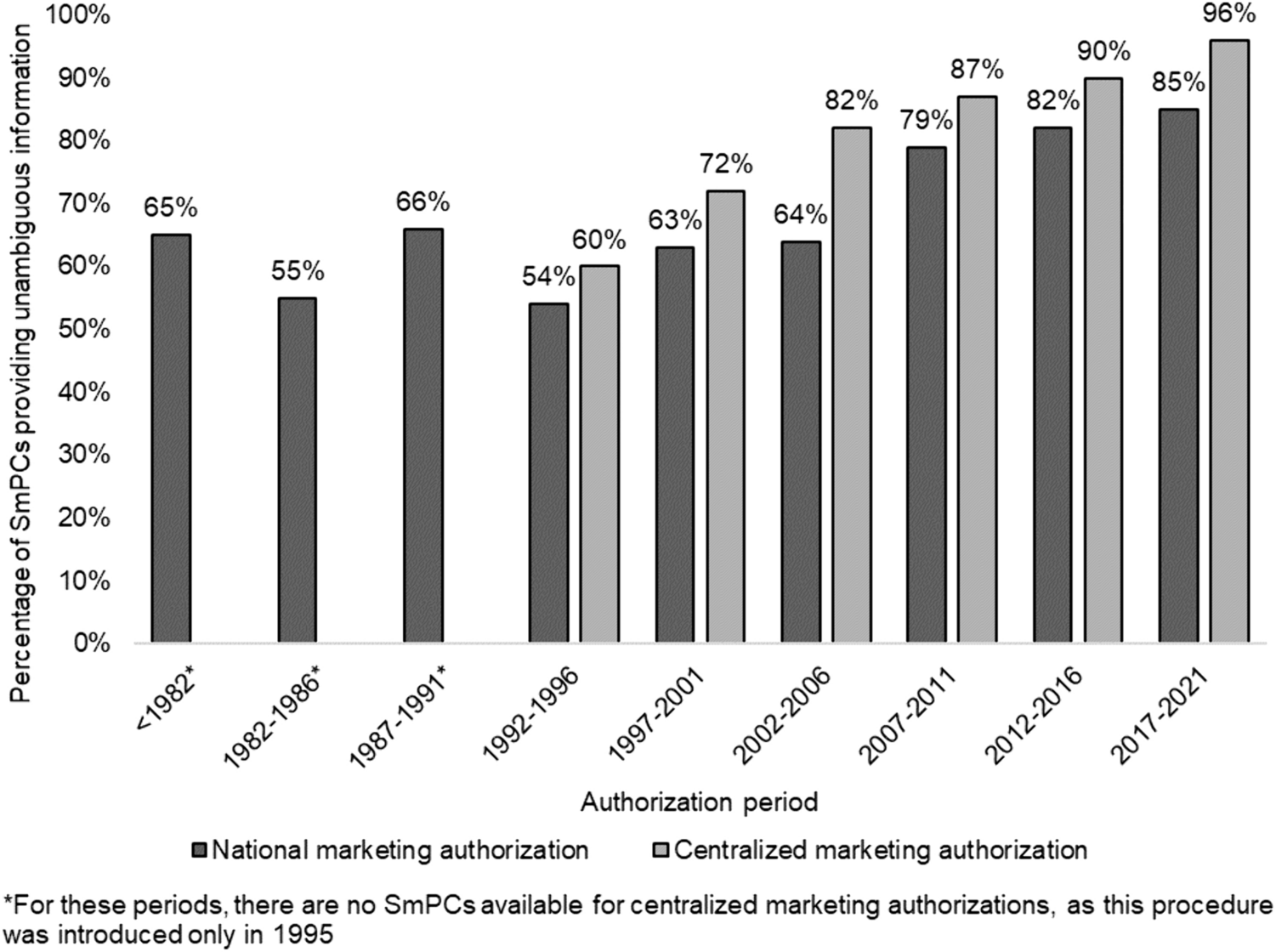 Percentage of indications for which unambiguous information was provided by type of marketing authorization and authorization period