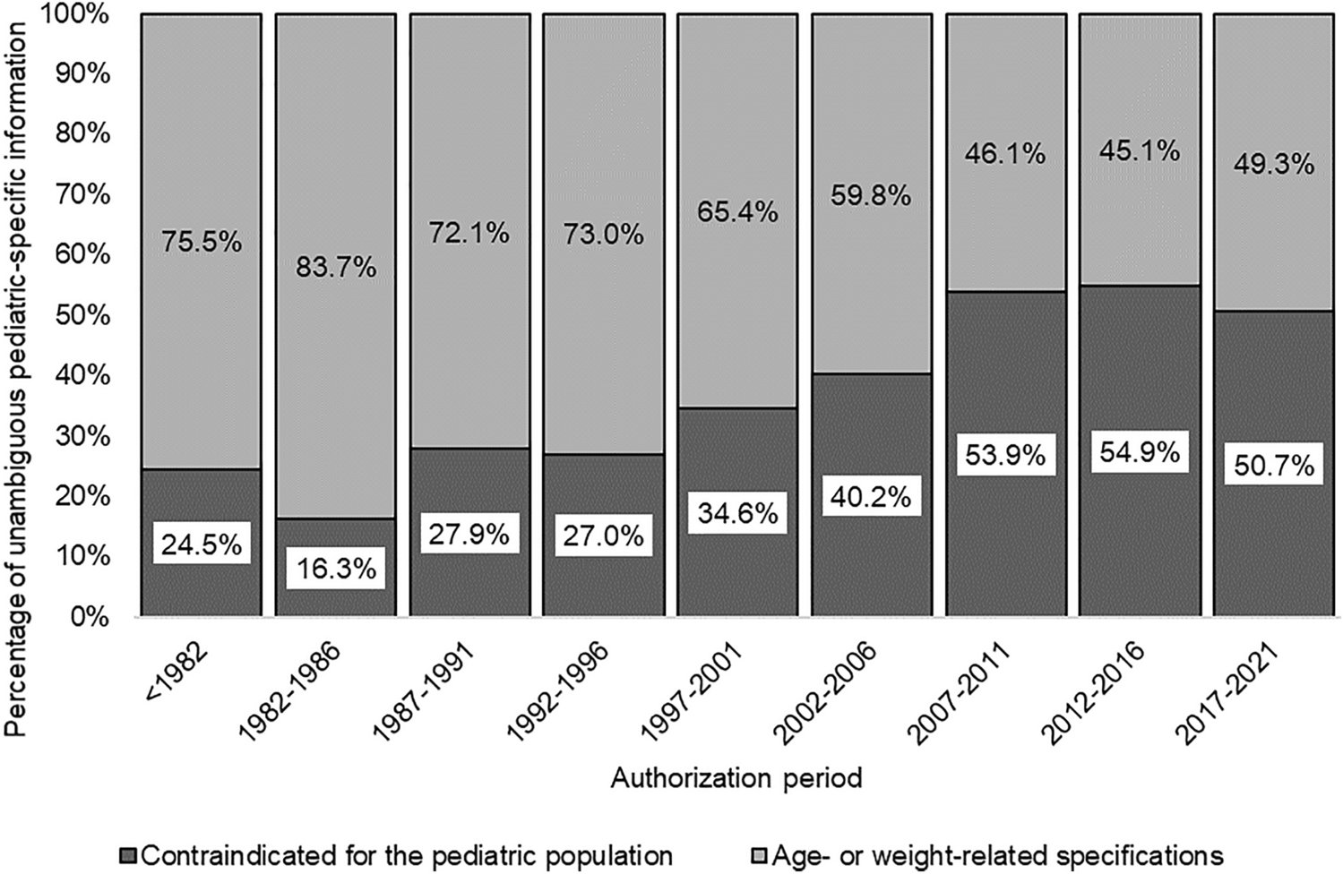 With regard to indications for which unambiguous information was provided, the proportion of disclosed contraindications for all children and adolescents under 18 years of age increased from 34.6% (950/2745) in the authorization period 1997–2001 to 50.7% (1357/2674) in the authorization period 2017–2021 (p < 0.001; Fig. 3).