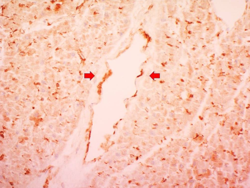 Ein Ausschnitt aus einem Myokard eines COVID-19-positiven Patienten, immunhistochemisch gefärbt für ACE2-Rezeptoren. Das Gefäßnetz im Myokard zeigt reichlich ACE2-Rezeptoren sowohl in einer Arteriole (Pfeile) als auch in multiplen intramyokardialen Kapillaren. Immunhistochemie für ACE2-Rezeptoren