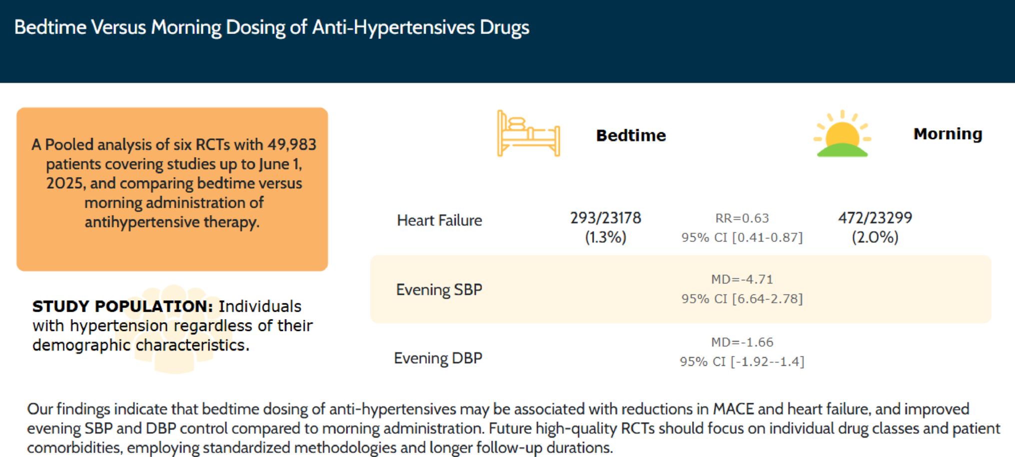 We conducted a meta-analysis of randomized controlled trials (RCTs) comparing bedtime versus morning administration of antihypertensive therapy. A comprehensive literature search was performed in PubMed, Embase, Cochrane Library, Scopus, and Web of Science databases up to June 2025. Pooled risk ratios (RRs) were calculated for categorical outcomes, and mean differences (MDs) for continuous variables. All statistical analyses were performed using R version 4.3.3. PROSPERO registration ID: CRD420251113957.