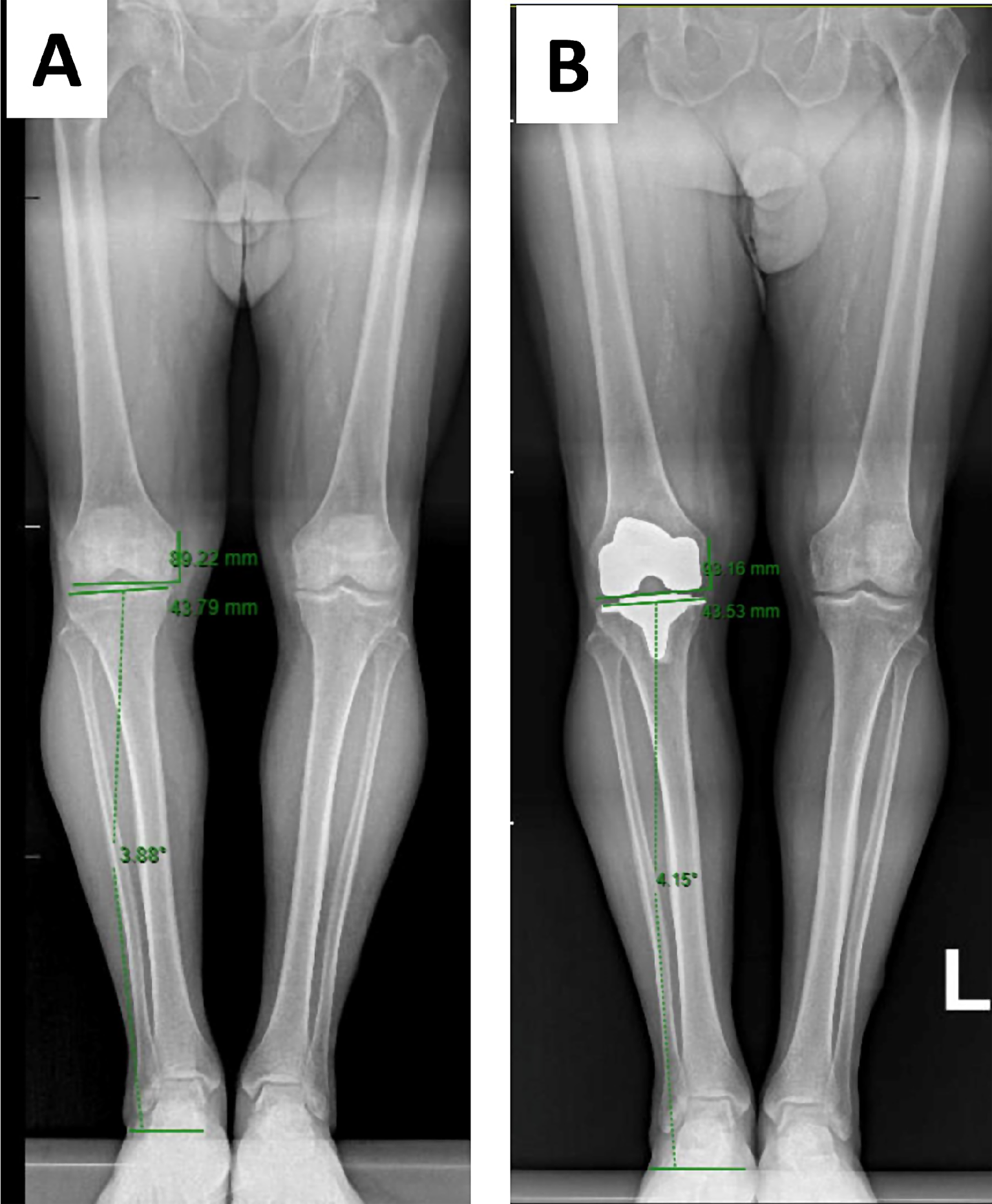 Preoperative (A) and postoperative (B) full-length standing AP radiographs with joint line obliquity and joint line height restoration measurements