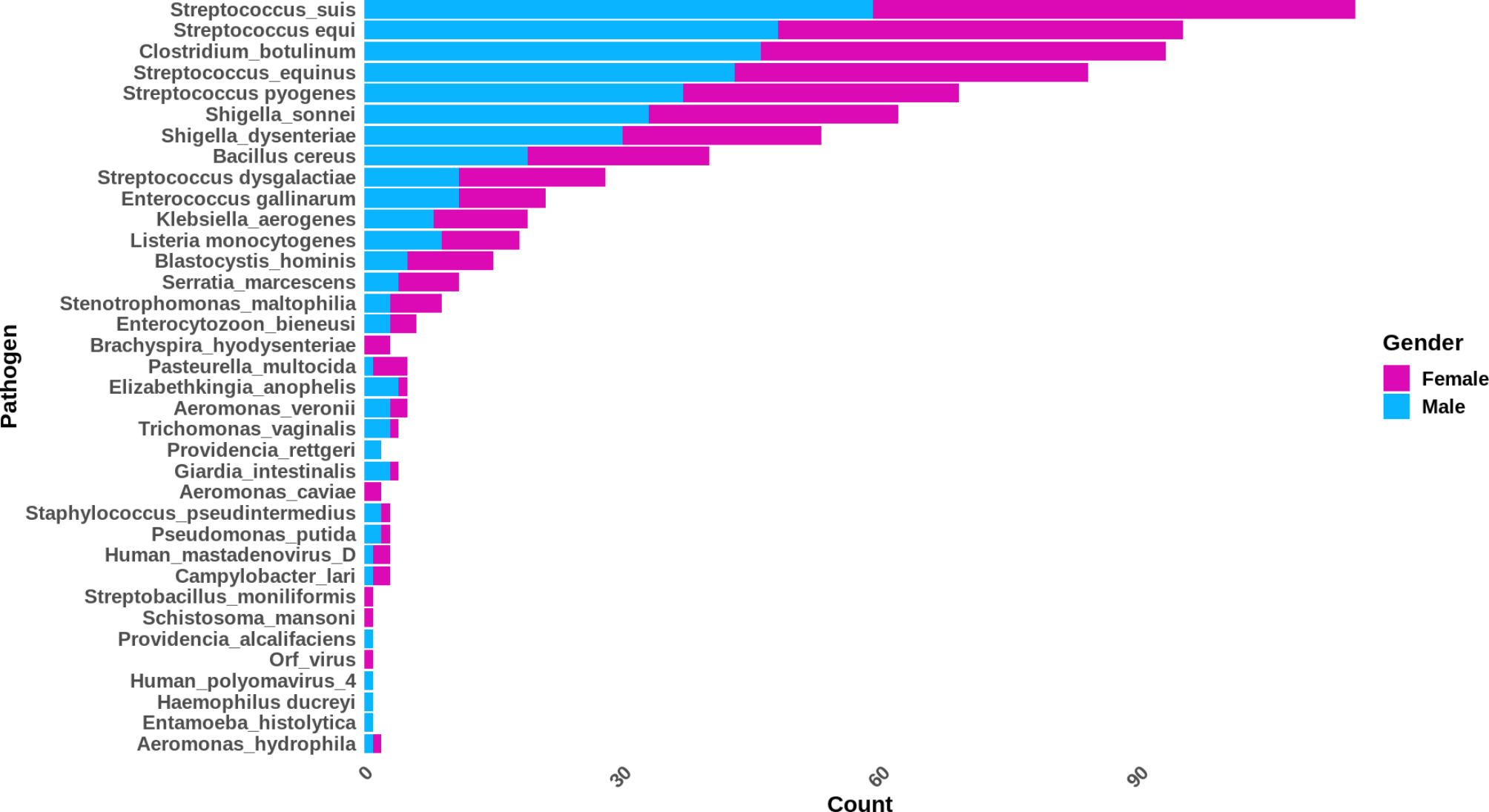 Various pathogens detected spanned multiple transmission routes and caused a range of symptoms. These included sexually transmitted pathogens, zoonotic pathogens, foodborne pathogens, urinary tract pathogens, and parasites. Notable parasites such as