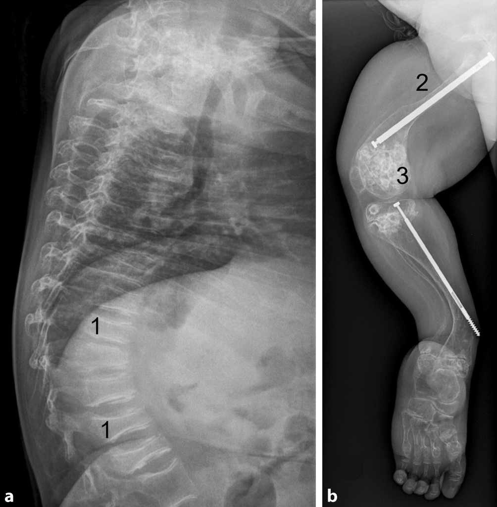 Röntgenaufnahme der lateralen Wirbelsäule (a) einer Patientin mit einer schweren Verlaufsform einer Osteogenesis imperfecta , verursacht durch eine qualitative Störung in COL1A2. Es sind ausgeprägte Wirbelkörperveränderungen (z. B. 1, unauffälliger Wirbelkörper hat 2:3- bis 4:5-Verhältnis von Höhe zu Breite) zu sehen. Aufnahme eines Beines der gleichen Patientin mit Z. n. operativer Frakturversorgung und Begradigung mit einem Teleskopnagel (2) mit typischer dünner Kortikalis und Auftreibung der Epiphysen mit eingesprengten Knorpelfragmenten, die zum Bild der Popcorn-Epiphysen (3) führt. Die Verankerung des Nagels in der distalen Unterschenkelepiphyse scheint in der vorliegende Ebene nicht mehr gegeben und somit nicht optimal (b).