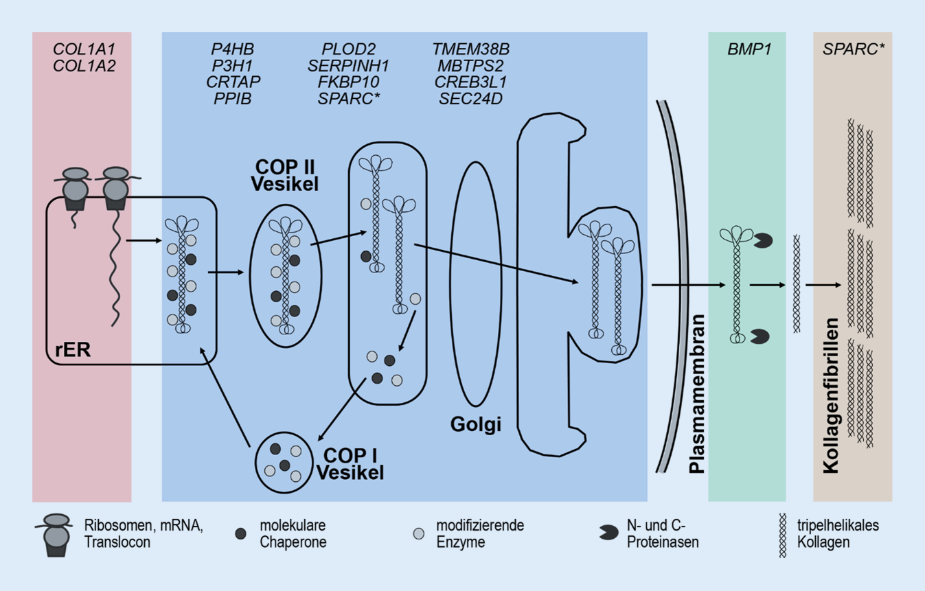 Physiologische Biosynthese des Kollagens und beteiligte Osteogenesis-imperfecta-Gene. Die α1- und α2-Ketten des Kollagen Typ 1 werden in das raue endoplasmatische Retikulum (rER) translatiert. Molekulare Chaperone binden an die sich faltenden Ketten und ermöglichen die Hydroxylierung von Prolin- und Lysinresten durch Hydroxylasen und die anschließende Glykosylierung der Prokollagenketten vor der Tripelhelixbildung. Das Prokollagenmolekül wird im Coat protein complex II (COP) vermittelten vesikulären Transport über das Golgi-Netzwerk in den Extrazellularraum sekretiert. Aufgrund des säuerlichen pH-Wertes im Golgi-Apparat lösen sich Chaperone und modifizierende Enzyme vom Prokollagenmolekül und rezirkulieren COP I-vermittelt zurück zum ER. Im Extrazellularraum werden die C‑ und N‑terminalen Propeptide durch verschiedene Proteinasen abgespalten. Die prozessierten Kollagenmoleküle lagern sich aneinander zu Kollagenfibrillen und werden mineralisiert. An der Biosynthese des Kollagens beteiligte Gene, in denen Mutationen bekanntermaßen eine Osteogenesis imperfecta auslösen können, sind aufgeführt und können der Translation (rot), posttranslationalen Modifikation (blau), Prokollagenprozessierung (grün) oder Fibrillenbildung (orange) zugeordnet werden. SPARC* hat sowohl eine intrazelluläre Funktion als molekulares Chaperon als auch eine extrazelluläre Funktion bei der Mineralisierung der Kollagenmatrix.