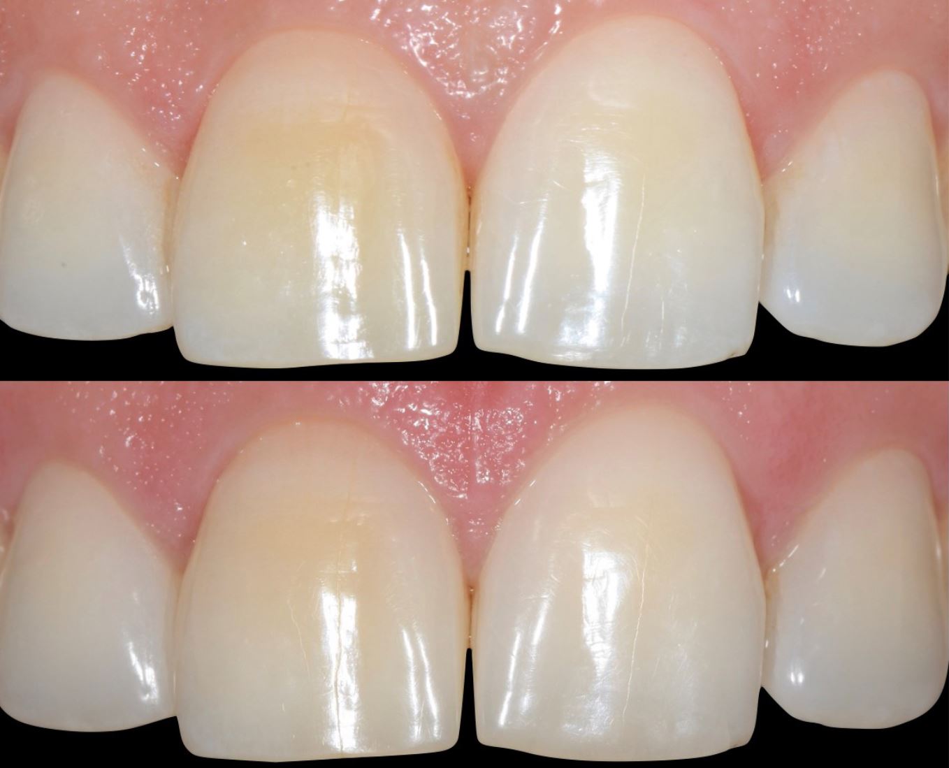 Die Endergebnisse, die mit beiden Bleichverfahren in Bezug auf die Farbaufhellung erzielt werden können, sind vergleichbar [3, 23]. Gegebenenfalls sind die Rate und der Grad an transienten Hypersensibilitäten nach dem Bleichen bei hoch konzentrierten Präparaten höher als bei niedrig konzentrierten Präparaten. Wie beschrieben, handelt es sich bei gelblich verfärbten Zähnen nicht "nur" um eine Farbeinlagerung, sondern auch um eine Strukturveränderung des Dentins. Daher gilt es zum einen zu berücksichtigen, dass eine erfolgreiche externe Bleichtherapie deutlich längere Anwendungszeiten benötigt, als es z. B. beim Aufhellen von Zähnen aus rein kosmetischer Sicht erforderlich ist. Bei Anwendung eines häuslichen Schienenbleichverfahrens kann die Dauer der Therapie bei stärkeren Verfärbungen daher durchaus mehrere Wochen bis Monate betragen, um stabile Langzeitergebnisse zu erzielen [17]. Zum anderen sollte mit dem Patienten besprochen werden, dass die Farbe eines zuvor gelblich verfärbten Zahnes nach einer Bleichtherapie zwar sehr wahrscheinlich deutlich aufgehellt sein wird, aber aufgrund der oben genannten kalzifizierenden Metamorphose nicht zwingend der identischen Farbe des Nachbarzahnes entsprechen muss.