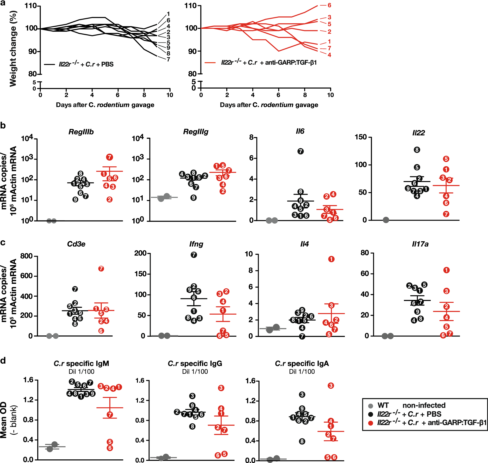 Control and clearance of C. rodentium infection require both innate and adaptive immune responses [16, 28]. We tested whether anti-GARP:TGF-β1 mAbs could alter these responses in the intestines of highly susceptible Il22r−/− mice. Mice received C. rodentium by oral gavage on day 0, and i.p. injections of anti-GARP:TGF-β1 or PBS on days -1 and + 6. Weights were measured daily (Fig. 2a), and sera and colons were collected 9 days after gavage.