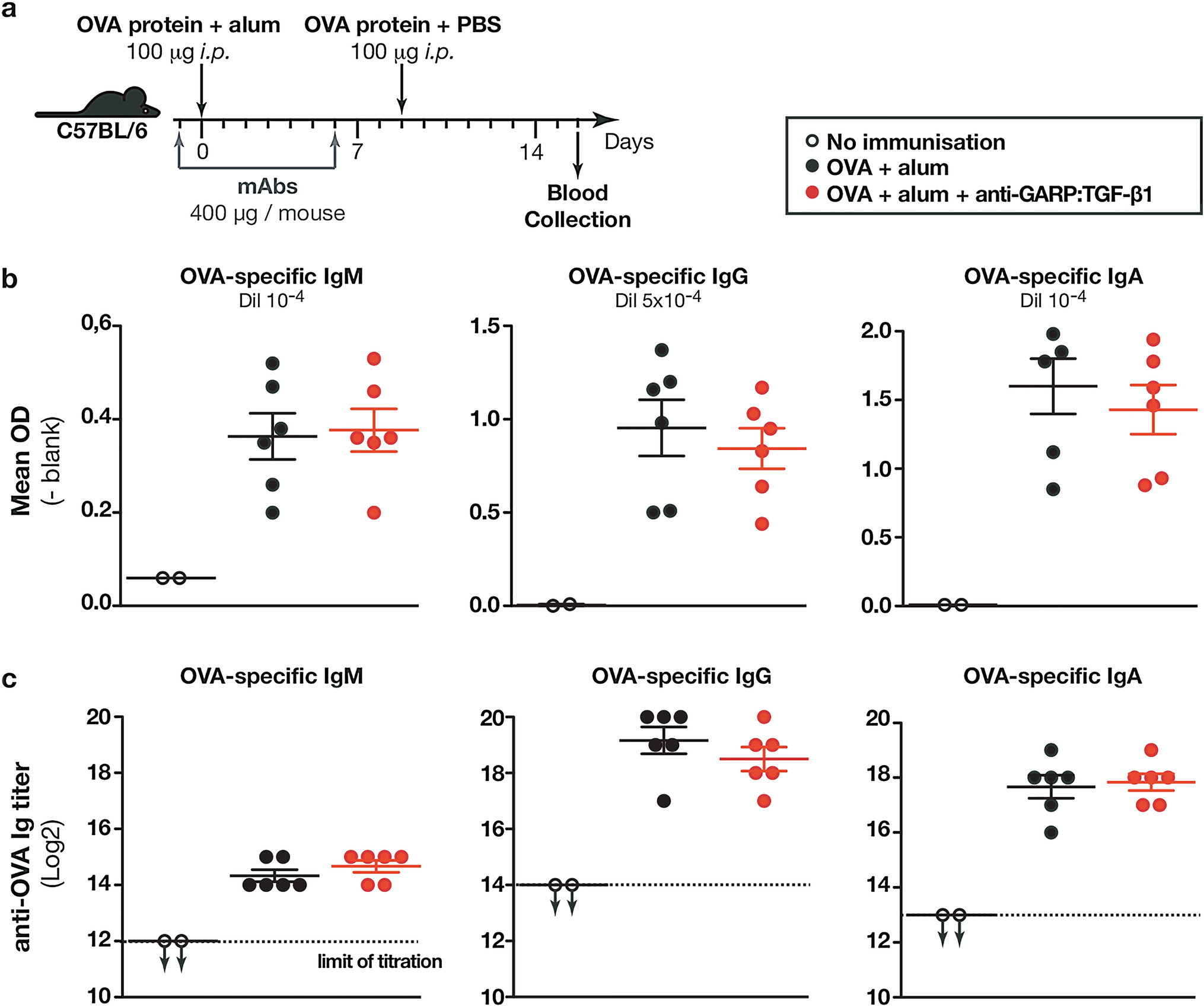 Antibody-mediated blockade of TGF-β1 produced from GARP:TGF-β1 complexes does not modify the amplitude of OVA-specific Ab responses upon immunization with OVA and alum. a Schematic representation of the experimental design. Three-month-old C57BL/6 mice were treated with mAbs 1 day before and 6 after i.p. OVA protein immunization with alum. After 9 days, OVA protein in PBS was injected i.p. as boost. Blood was collected on day 16 to measure OVA-specific Igs in sera by ELISA. b-c Data points represent values in individual mice. Horizontal lines indicate mean ± sem (n = 6 mice per group). Statistical analysis was performed with a Mann–Whitney unpaired t-test. No statistically significant difference was observed between OVA-immunized mice treated with PBS or anti-GARP:TGF-β1 (P > 0,05). Results shown are representative of two independent experiments