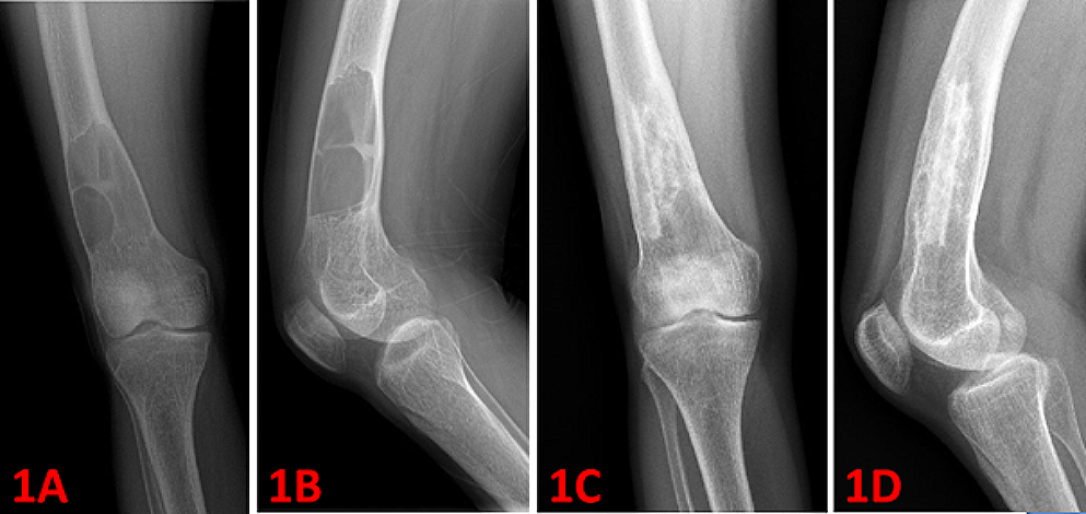 A 18-year-old female with osteolytic lesion (brown tumor) in the right distal femur (1 A and 1B: preoperative radiograms). Curettage was performed, followed by iliac crest autografting and cancellous allografting was applied. Figure 1 C and 1D shows postoperative 12th months radiograms