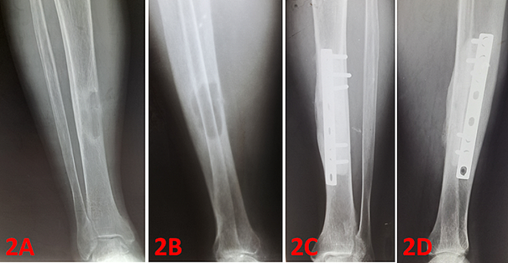 A 47-year-old male with brown tumor in the right tibial diaphysis (2 A and 2B: preoperative radiograms). Curettage and cementing was applied, followed by fixation was perfomed by using DCP plate. Figure 2 C and 2D shows postoperative 48th months radiograms