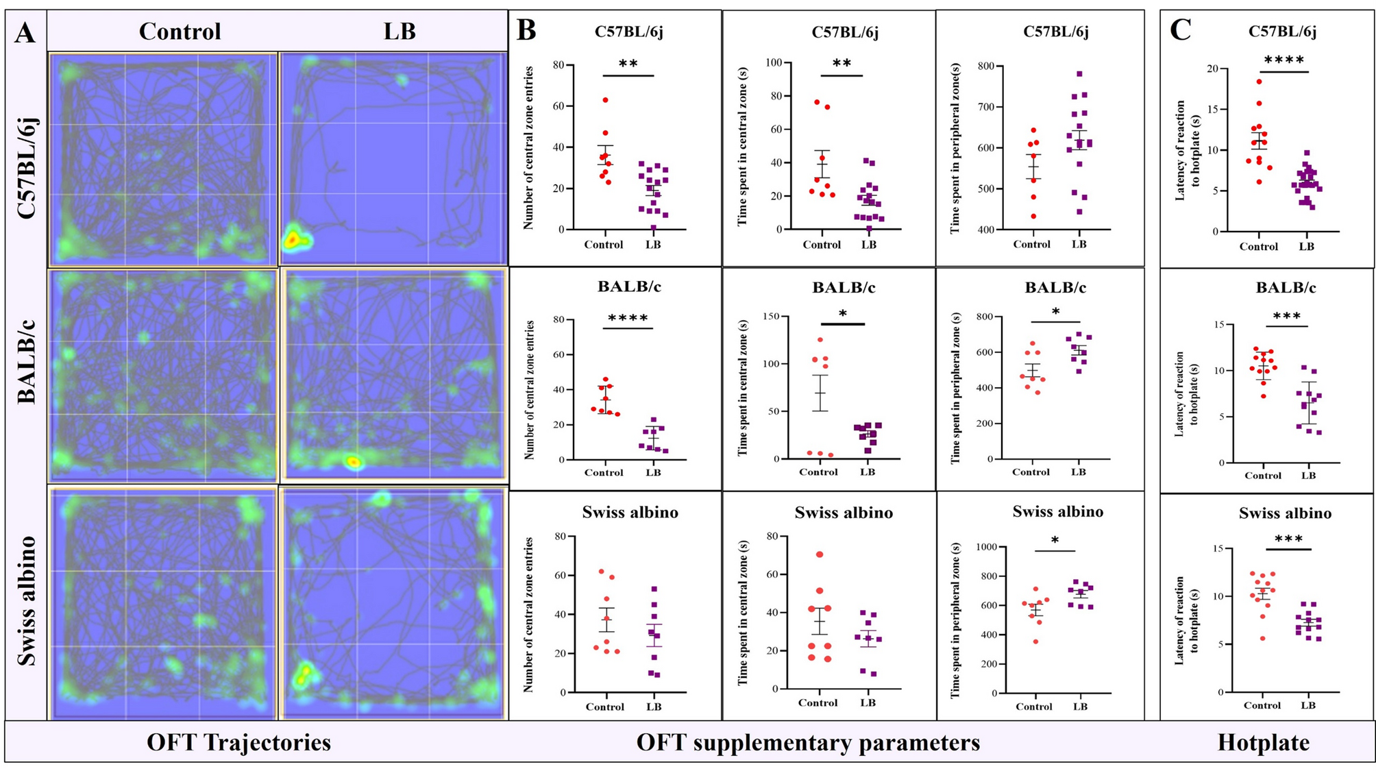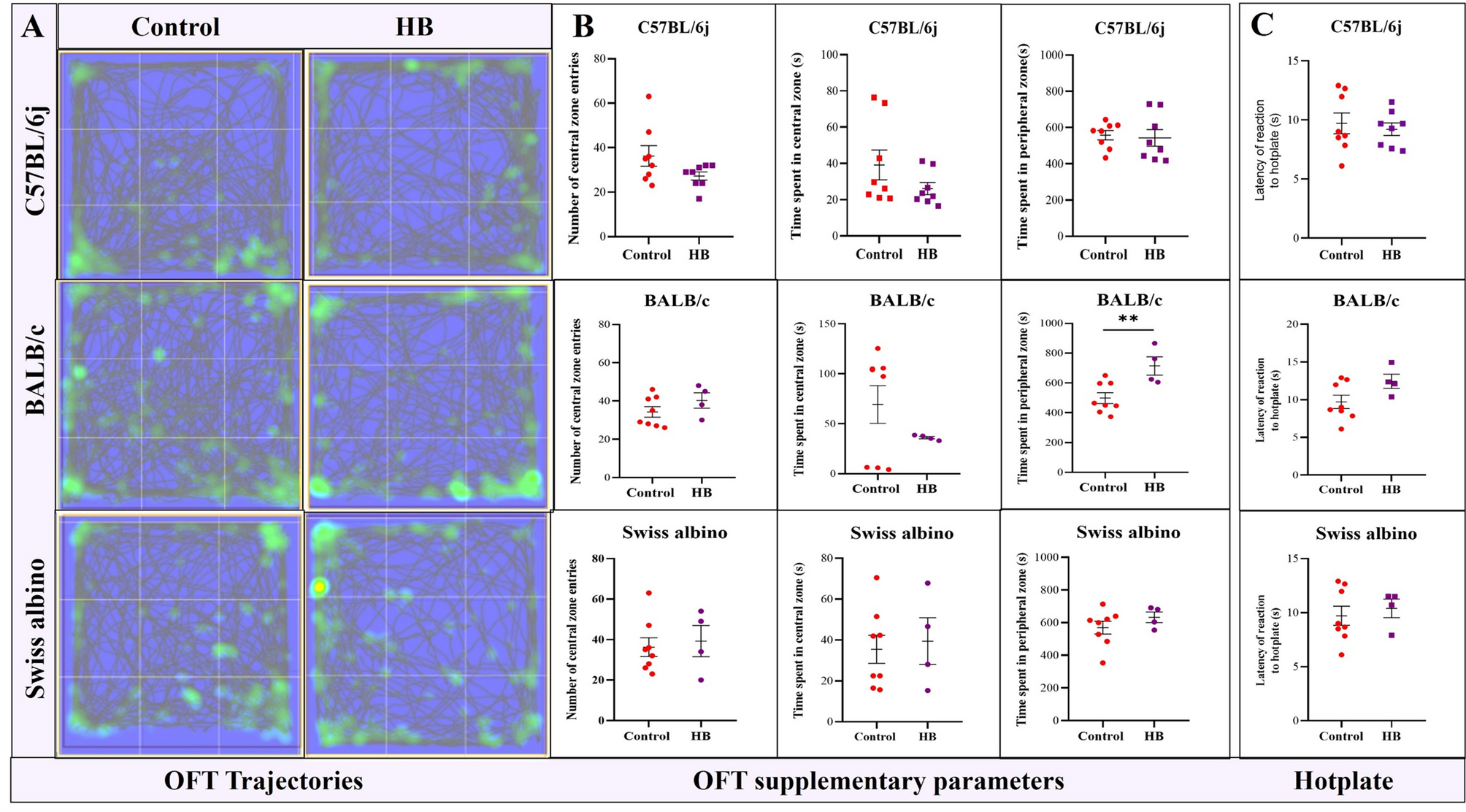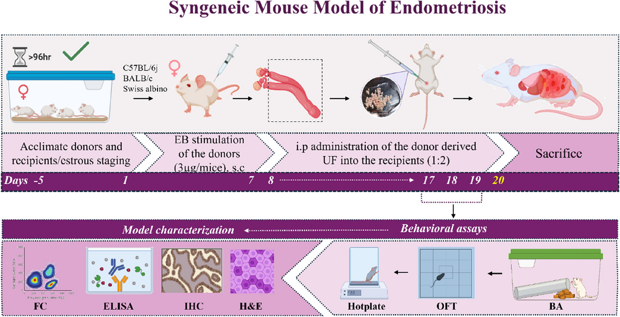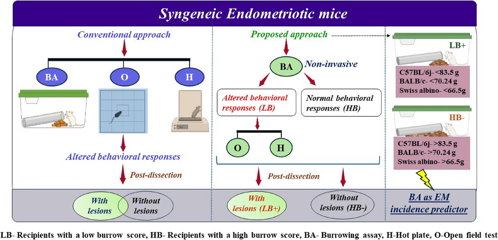We planned a systematic study using three strains of commonly used laboratory mice, C57BL/6j, BALB/c, and Swiss albino. We employed a total of 57 C57BL/6j (18 controls, 13 donors, and 26 recipients), 73 BALB/c (25 controls, 16 donors, and 32 recipients), and 58 Swiss albino (16 controls, 14 donors, and 28 recipients) mice for EM induction. This number variation resulted from the logistics involved in a large-scale initial screening to ensure an adequate number of mice across different genetic backgrounds were included for the primary validation of the BA. A syngeneic EM mice model was developed by i.p injecting the donor uterine fragments (UF) into the abdominal cavity of recipient mice. BA was used as the first screening tool to obtain a burrowing score, and a total of n = 26 for C57BL/6j, n = 32 for BALB/c, and n = 28 for Swiss albino mice were used. Then, all the recipients were chosen for the subsequent behavioral assays. It comprised of, LB (1) OFT, C57BL/6j (n = 8 control and n = 16 LB), BALB/c and Swiss albino (n = 8 control and n = 8 LB), and (2) Hot plate, C57BL/6j (n = 12 control, n = 24 LB), BALB/c and Swiss albino (n = 12 control, n = 12 LB), HB (1) OFT, C57BL/6j (n = 8 control and n = 8 HB), BALB/c and Swiss albino (n = 8 control and n = 4 HB), and (2) Hot plate (C57BL/6j, n = 8 control, n = 8 HB) BALB/c and Swiss albino (n = 8 control, n = 4 HB).