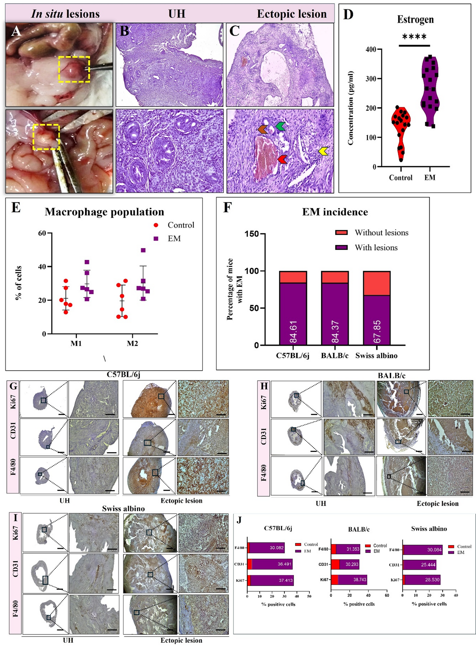 Adult female C57BL/6j, BALB/c, and Swiss albino mice (8 weeks old, weighing 22–28 g) were procured from the Central Animal Research Facility at Manipal Academy of Higher Education. They were housed in standard conditions of controlled temperature (23 ± 2 °C), humidity (50–55%), and light-dark cycle (12–12 h) with ad libitum access to water and food throughout the study. Animals were group-housed (4–5 per cage) in ventilated polypropylene cages with husk bedding. The study was approved by the Institutional Animal Ethics Committee at Kasturba Medical College, Manipal (Approval Numbers: BALB/c- IAEC/KMC/45/2022, C57BL/6j- IAEC/KMC/88/2024, Swiss albino- IAEC/KMC/56/2022). The animal numbers were determined based on previous studies utilizing the syngeneic endometriosis mouse model [26]. Institutional guidelines and the guidelines of the Committee for the Purpose of Control and Supervision of Experiments on Animals (CPCSEA)were strictly followed for animal handling, and the reporting of animal experiments follows ARRIVE (Animal Research: Reporting of In vivo Experiments) guidelines.