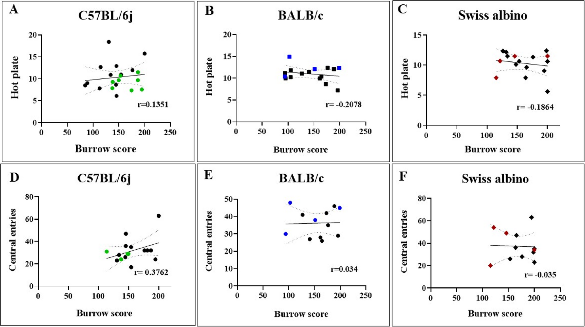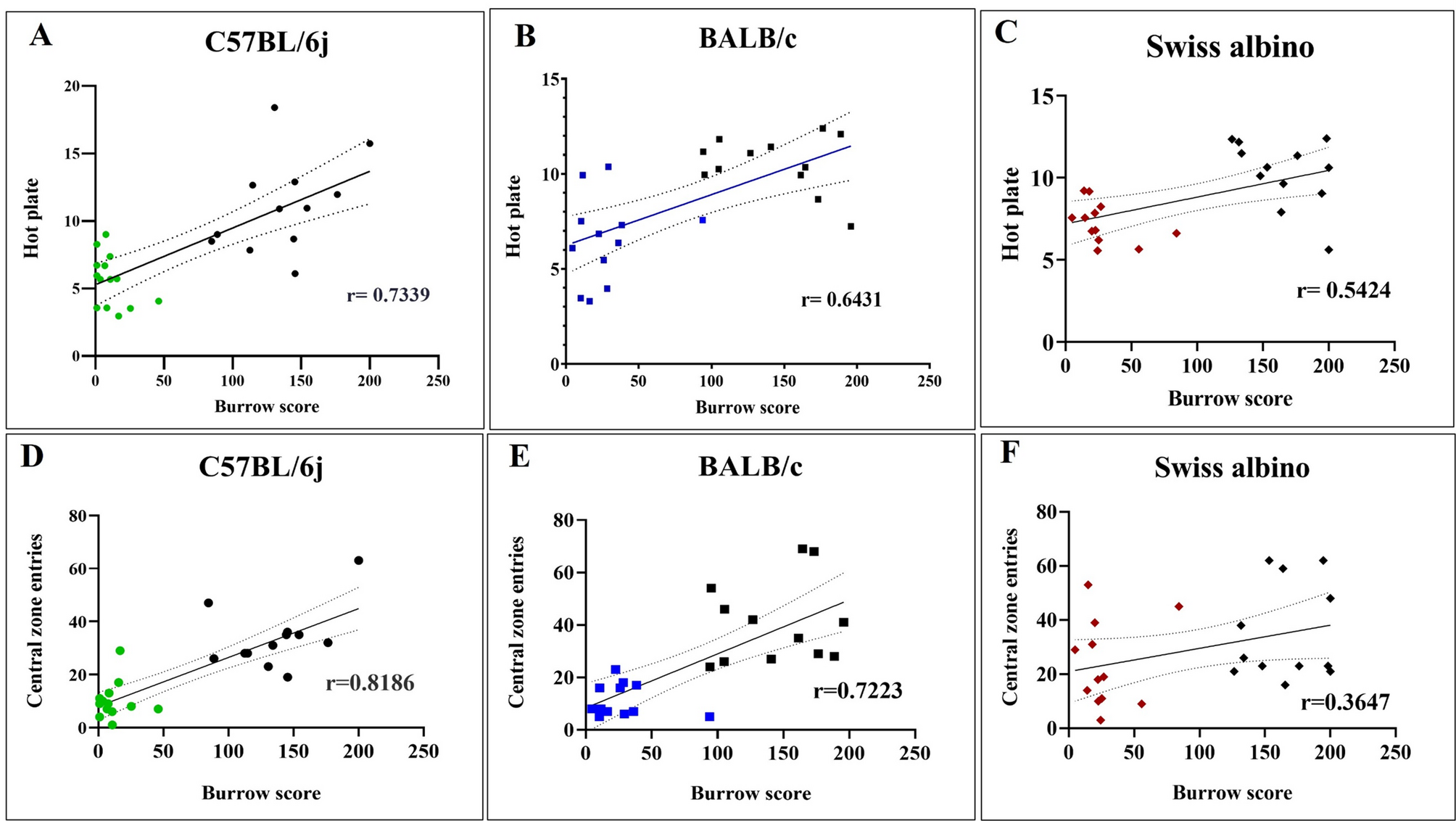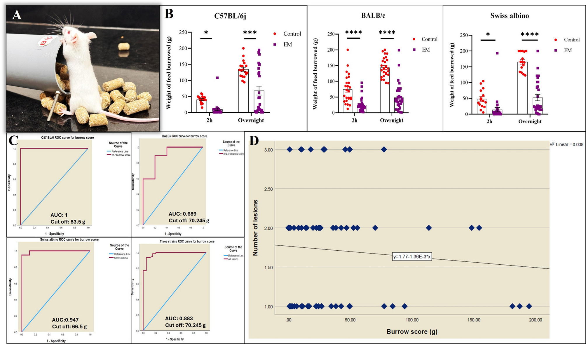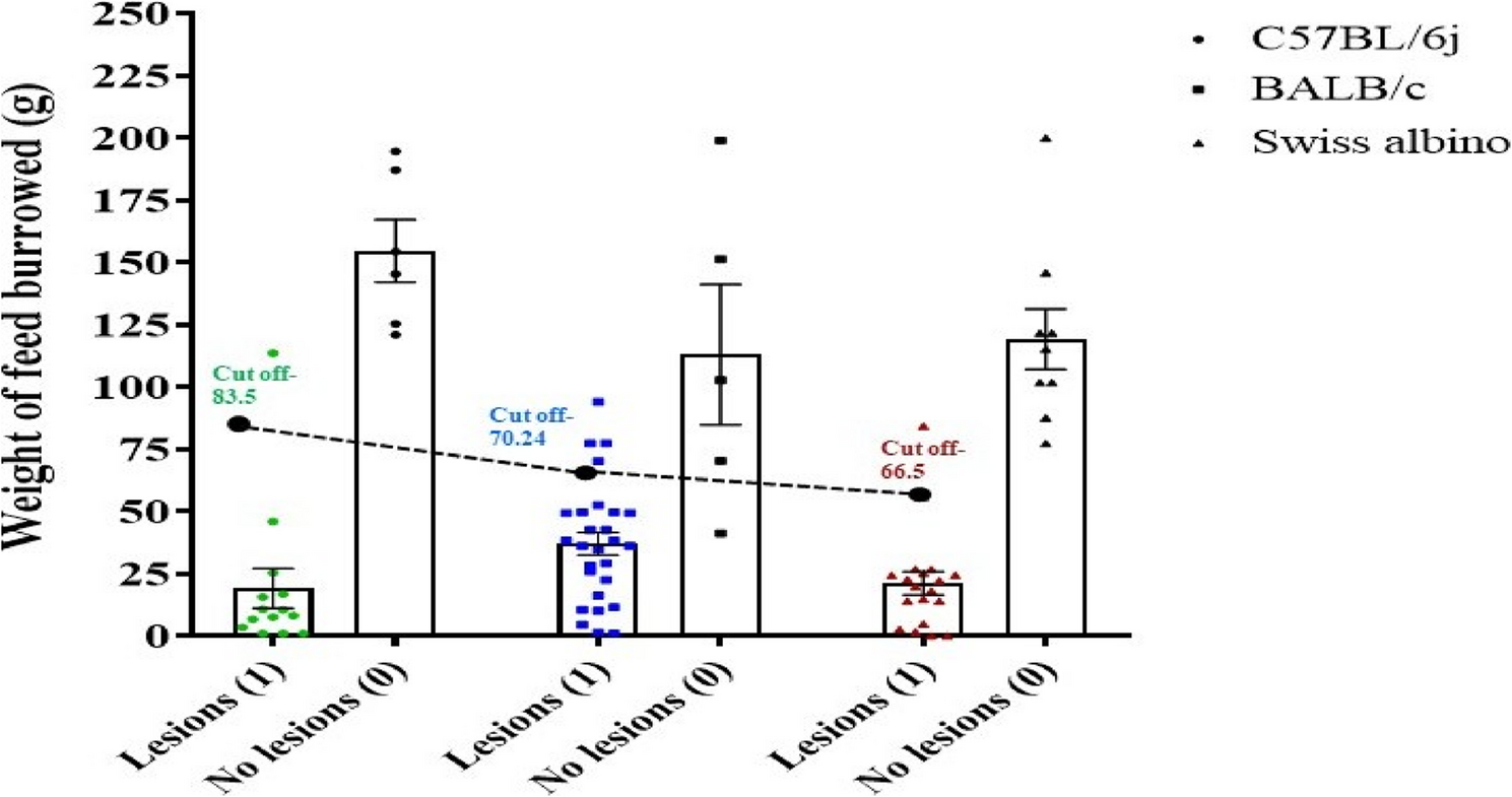 We employed a non-invasive method based on the altered burrowing behavior of the animal to predict lesion development in the syngeneic mice EM model. We used the burrowing assay (BA) before dissection as a non-invasive behavioral marker to evaluate lesion progression across three distinct laboratory strains: C57BL/6j, BALB/c, and Swiss albino to account for variation due to genetic, immunological, and strain specificity.