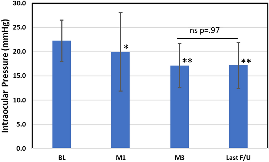 Intraocular pressure (IOP) at Baseline and Follow-up Assessments. Error bars are ± 1 SD Comparison of follow-up with baseline (Mann–Whitney rank sum): one asterisk, p < .01; two asterisks, p < .001; ns, not significant. BL = preoperative baseline, M1 = month 1, M3 = month 3, F/U = follow-up