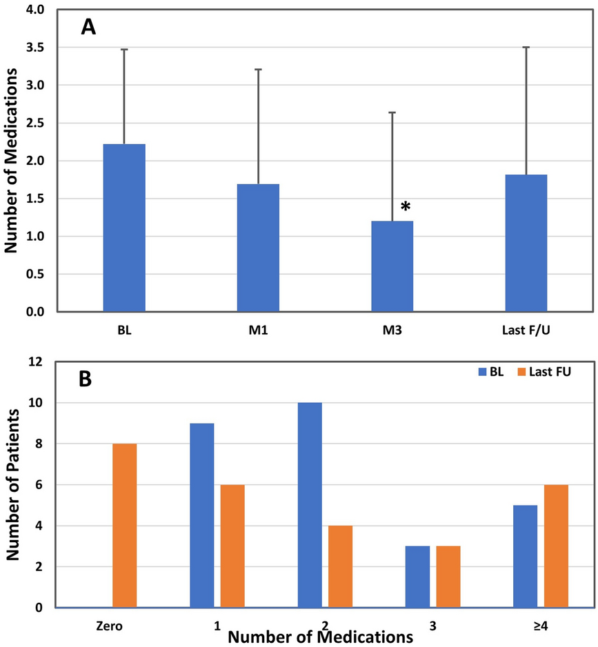 Patients were under treatment with an average of 2.2 (1.3) medications at pre-OSS BL which was reduced by 1.0 and 0.4 to 1.2 (1.4) and 1.8 (1.7) medications at 3 months and last follow-up (p < .01 and p = .193, respectively) (Fig. 2A). Most (81.5%) patients were on the same or fewer medications at last follow-up as at the pre-OSS BL; 12 had a decrease in medications, 5 an increase, and 10 had the same number. Moreover, no patients were untreated with medication at BL, while 8 were (30%) at last follow-up (Fig. 2B).