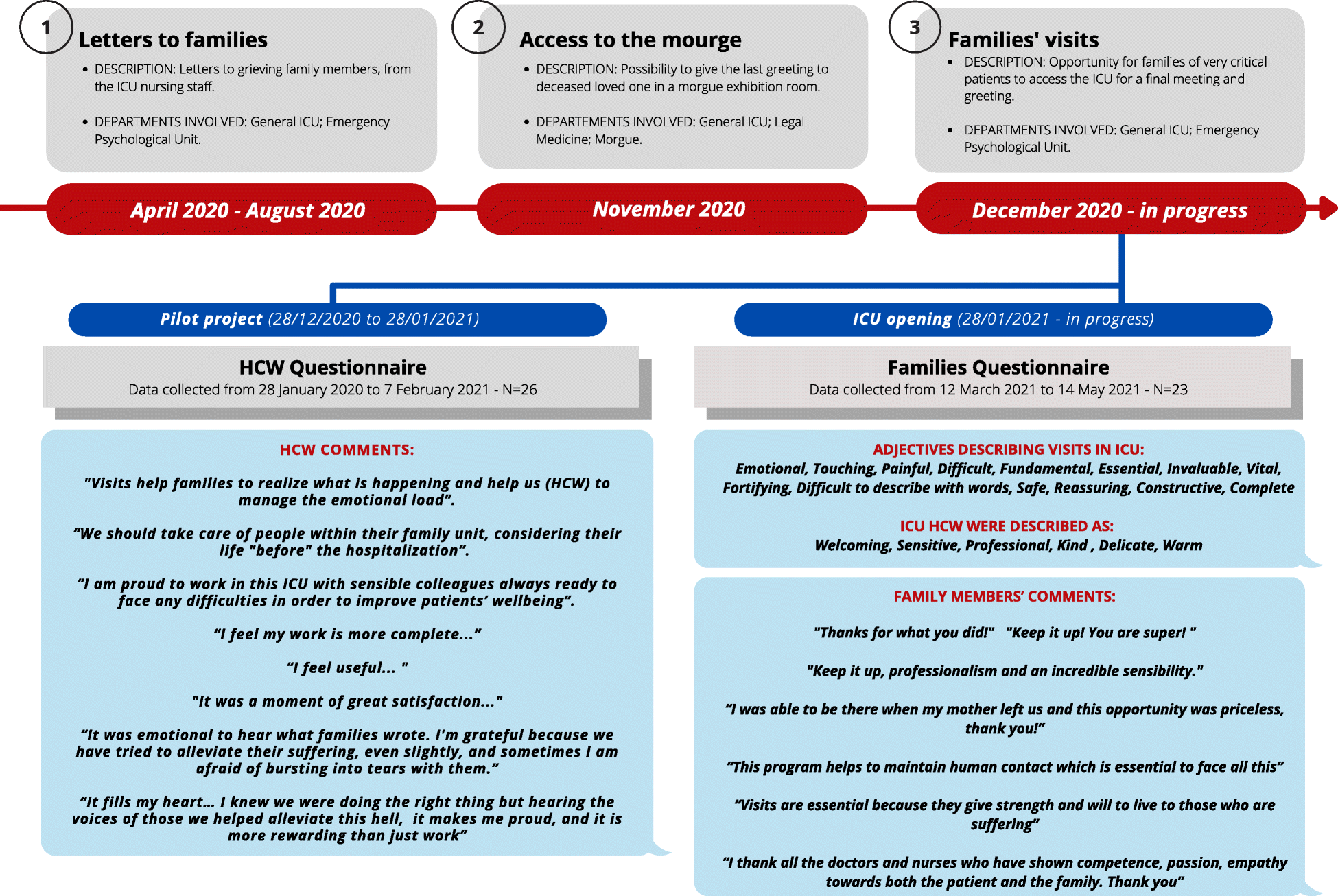 Project timeline and surveys. Project timeline; the different departments involved; some of HCW and family members’ comments, collected through the questionnaires. Abbreviations: ICU, intensive care unit; HCW, healthcare workers