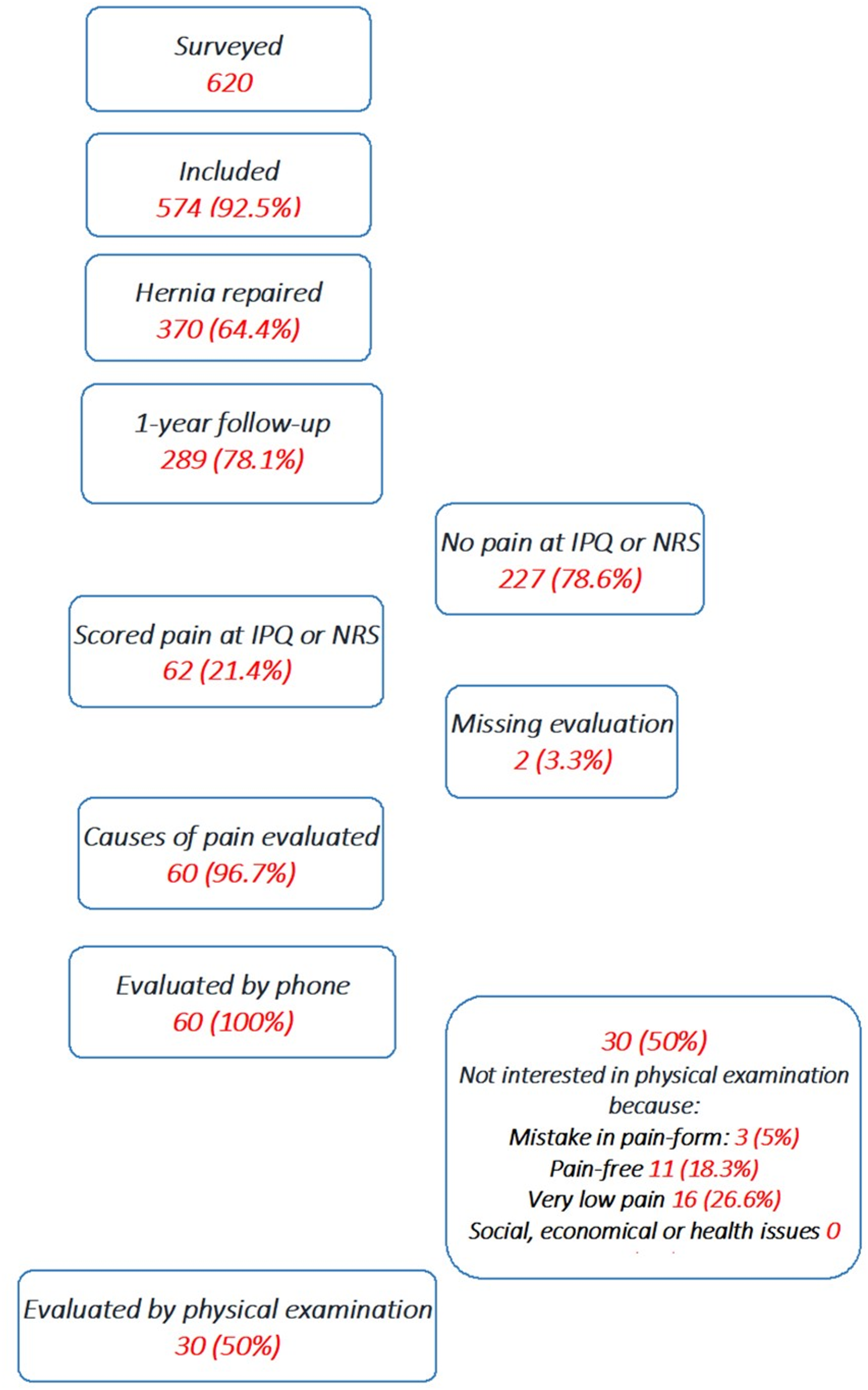 62 patients (21.4%) stated discomfort or pain one year after surgery, 19 patients scored NRS ≥ 3. The mean NRS of these 62 patients was 1.9 (SD 2.3) (Min 1-Max 10). Of these, 60 (96.7%) were evaluated by phone consultation and offered a physical evaluation. 30 (50%, 30/60) patients accepted a physical examination. The main reasons for not attending a physical examination of the remaining 30 (50%, 30/60) patients were absence or improvement of pain in such a way that patients did not consider a medical examination necessary (Fig. 1). Both patients who could not be contacted by phone rated pain 2 or less on NRS.