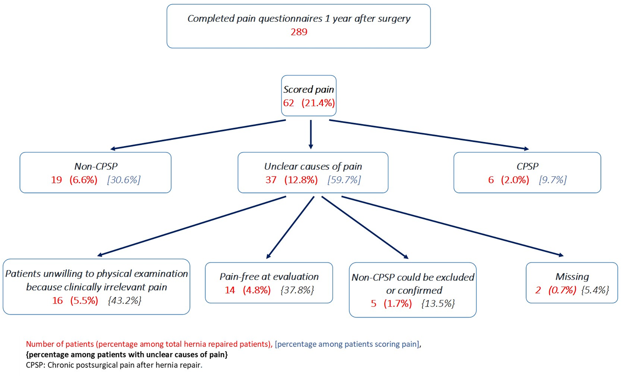 Six patients (2%, 6/289) had chronic post-surgical pain according to two different specialists and 37 (12.8%, 37/289) had unclear cause of pain (Fig. 2).