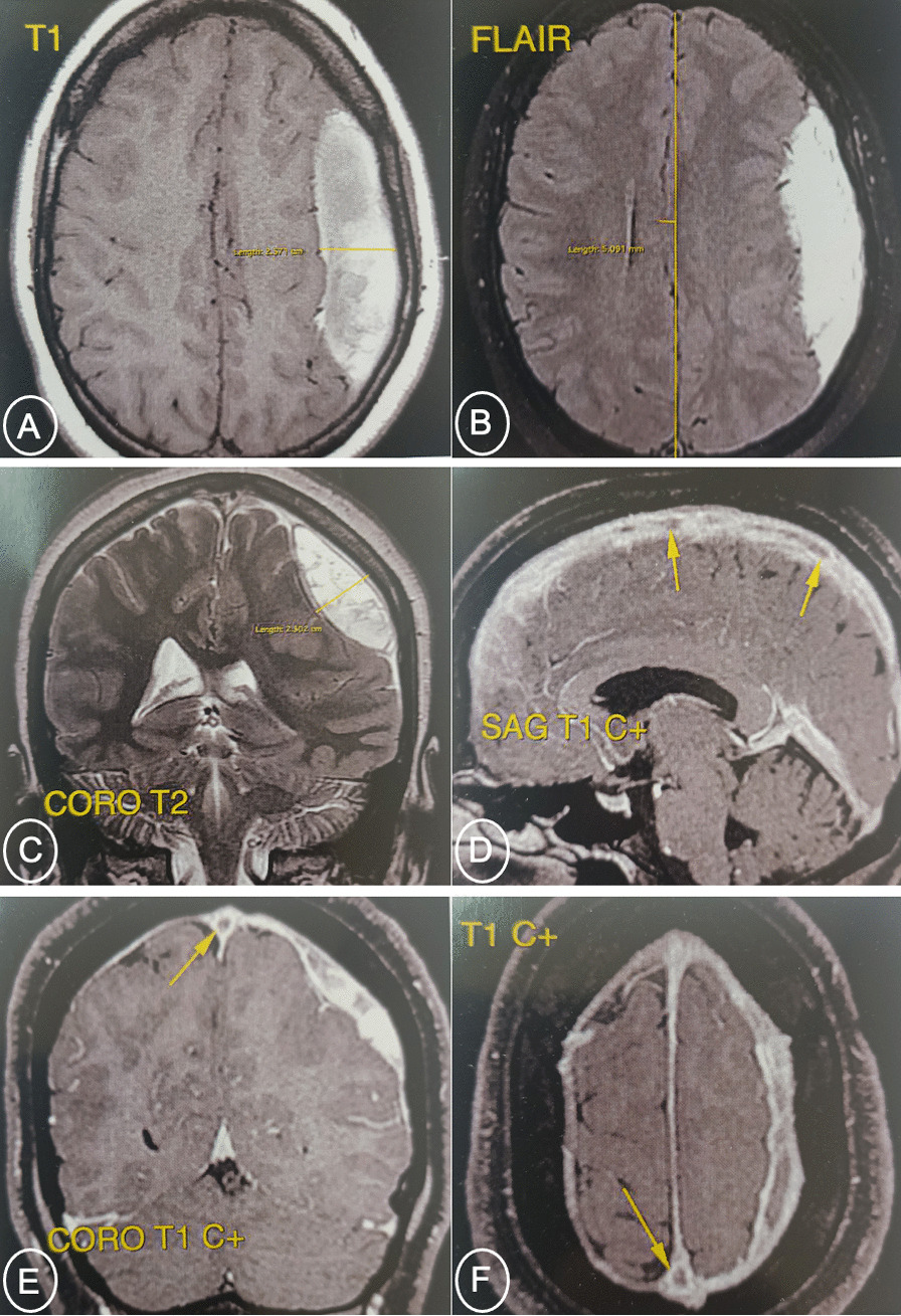 Contrast-enhanced brain MRI revealed cerebral venous thrombosis of the superior longitudinal sinus (empty delta sign) with a 25 mm thick left fronto-parietal chronic subdural hematoma resulting in a 5 mm midline deviation to the right side (Fig. 1).