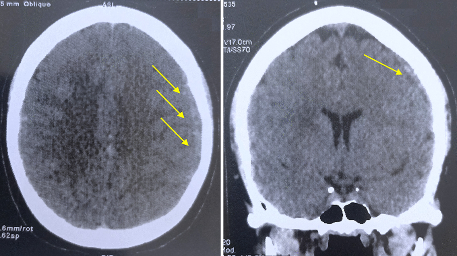 Cerebral angioscan after 1 month of treatment, showing a 9 mm SDH blade (yellow arrows)