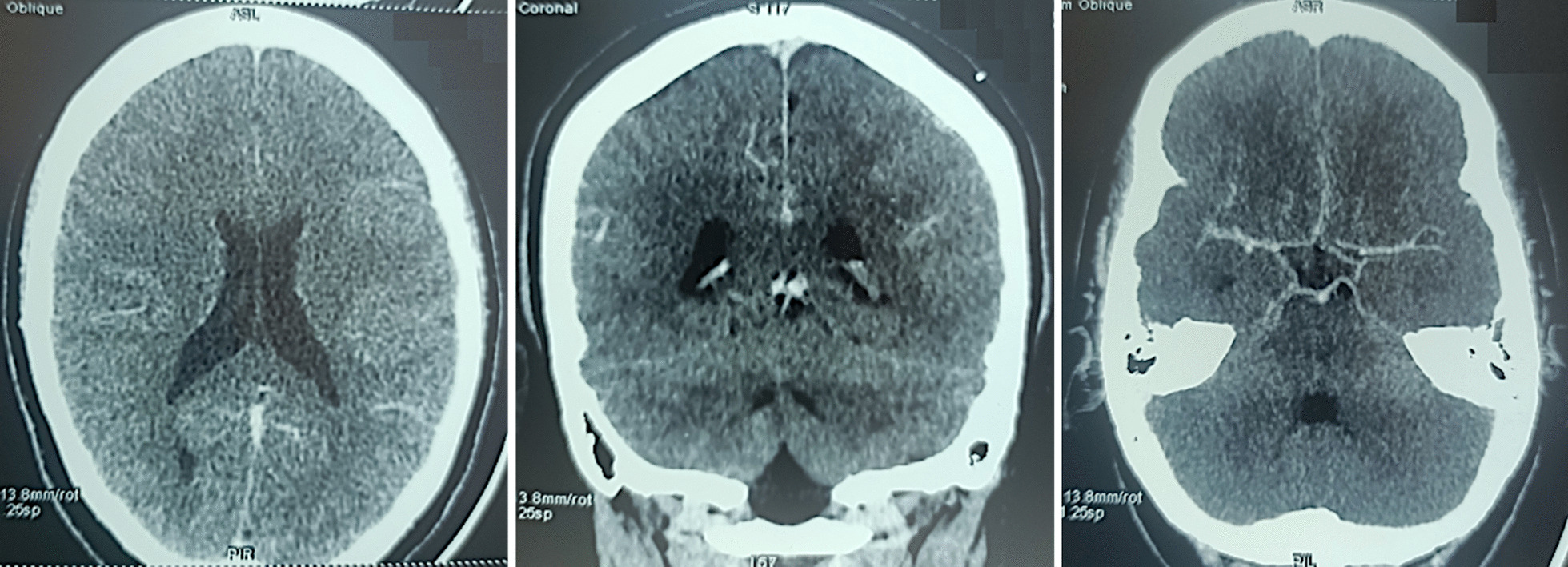 Cerebral angioscan at 3 months showed complete resolution of the chronic SDH and superior longitudinal sinus thrombosis with visible venous sinuses (Fig. 4). His clinical outcome at 3 months was excellent, justifying discontinuation of anticoagulant therapy and corticosteroids by degression.