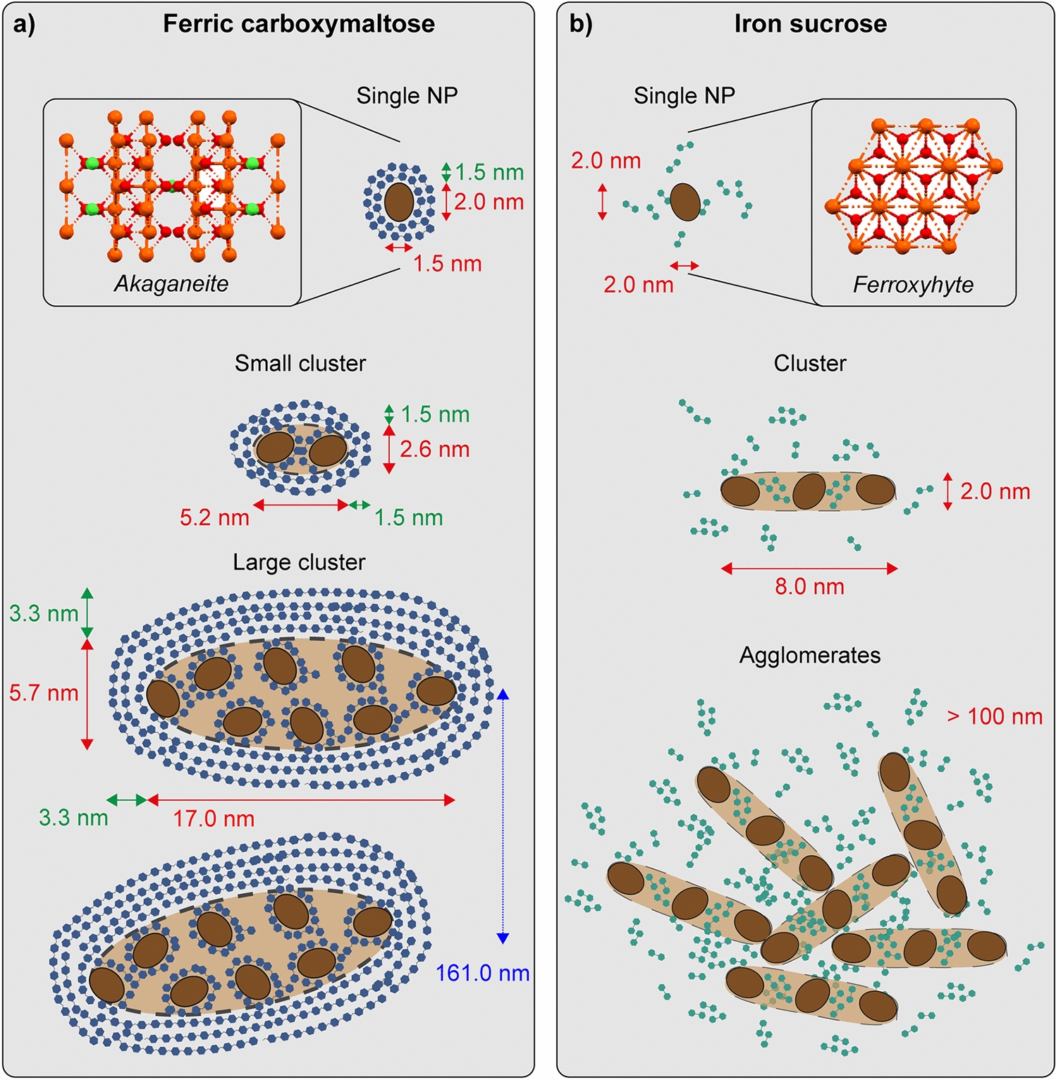Proposed 3D physical structure of two iron–carbohydrate nanoparticles, ferric carboxymaltose and iron sucrose (from [17]). Brown circles: iron cores; blue dotted line: localized carboxymaltose ligand; green dots: diffusely bound sucrose. Red ball-and-stick image denotes applicable ferric oxyhydroxide crystal structures. Orthogonal characterization employing techniques such as X-ray diffraction (XRD), cryogenic scanning transmission electron microscopy (cryo-STEM), small-angle X-ray scattering (SAXS), and small-angle neutron scattering (SANS) describe ferric carboxymaltose (FCM) as large prolate spheroidal clusters made up of several single NPs, small prolate spheroidal clusters made up of two single NPs, and free single NPs. Iron sucrose (IS) is described as prolate spheroidal clusters made up of single NPs, and a free, single, diffuse and dynamic layer of sucrose surrounding the clusters and/or single NPs