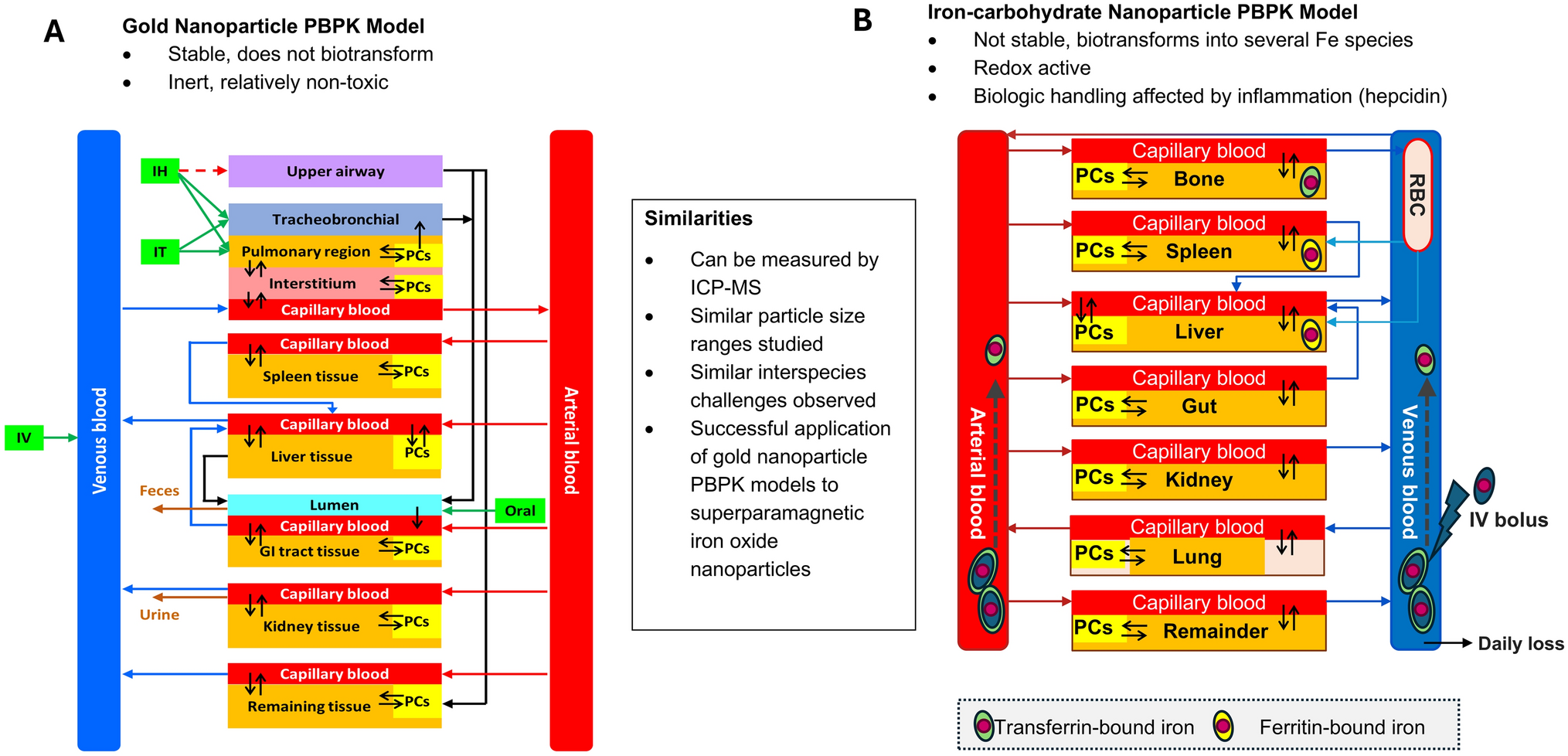 PBPK modeling is a computational modeling and simulation process that describes the absorption, distribution, metabolism, and excretion (ADME) of chemicals, nanoparticles, and/or their metabolites in the body on the basis of the interrelationships among key physiological, biochemical, and physicochemical properties using mathematical equations [42, 43]. PBPK models have been commonly used in human health risk assessment of environmental chemicals, animal-derived food safety assessment, and therapeutic optimization of drugs, as well as in the discovery, development, and approval of new drugs, especially small molecular drugs and biologics [44‐47]. Many PBPK models have also been developed for a variety of nanoparticles and have been shown to be useful in supporting nanoparticle risk assessment and improving our understanding of the ADME properties of nanoparticles [48, 49]. However, PBPK models have not been reported to support regulatory approvals of nanomedicines to date. Unlike small molecular drugs for which PBPK modeling methodology is well established, the methodology for PBPK modeling of nanomedicines is still developing. Nevertheless, there has been substantial progress in the PBPK modeling of nanoparticles. The following discussion will summarize what we have learned from PBPK modeling of small molecules and other nanoparticles that could facilitate development of PBPK models for iron–carbohydrate nanoparticles in the future.