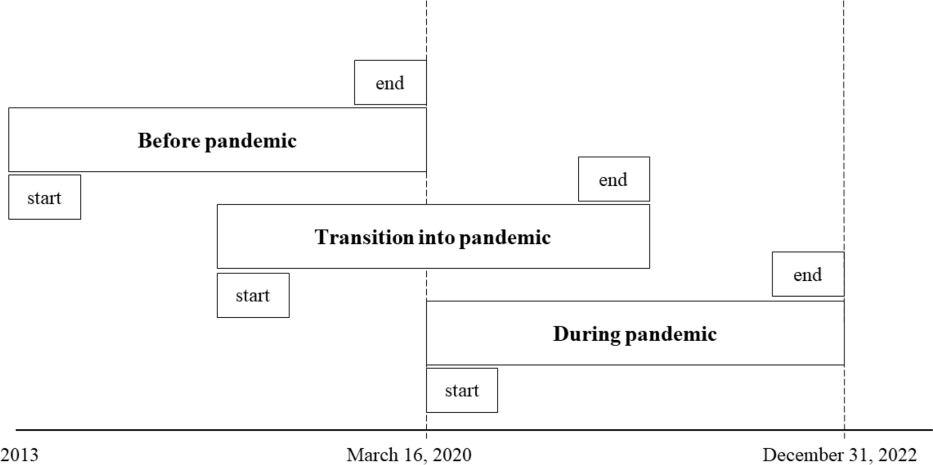 Subgroups used in analyses. Graphical representation of groups used in statistical analysis based on start and end of treatment relative to March 16, 2020 (i.e., relative to the COVID-19 pandemic)