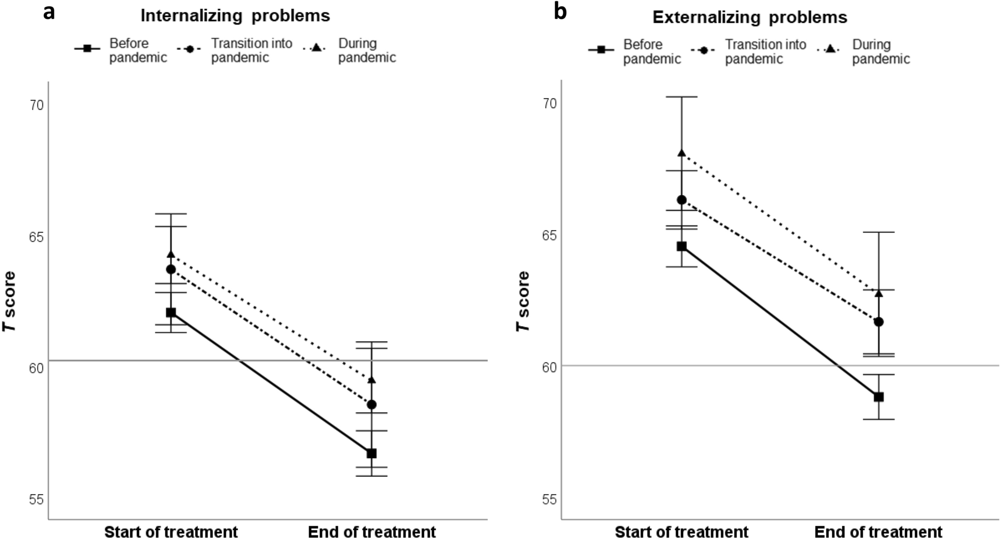 To test whether children entered care with elevated problems during the COVID-19 pandemic compared to before the pandemic two ANCOVAs were used to assess between-group differences in internalizing and externalizing problems at the beginning of treatment. Internalizing or externalizing problems at the start of treatment were included as dependent factors, and group as independent factor. Age of the child, sex of both the child and informant, and treatment duration were included as covariates. Post-hoc t-tests were used to test between-group differences.