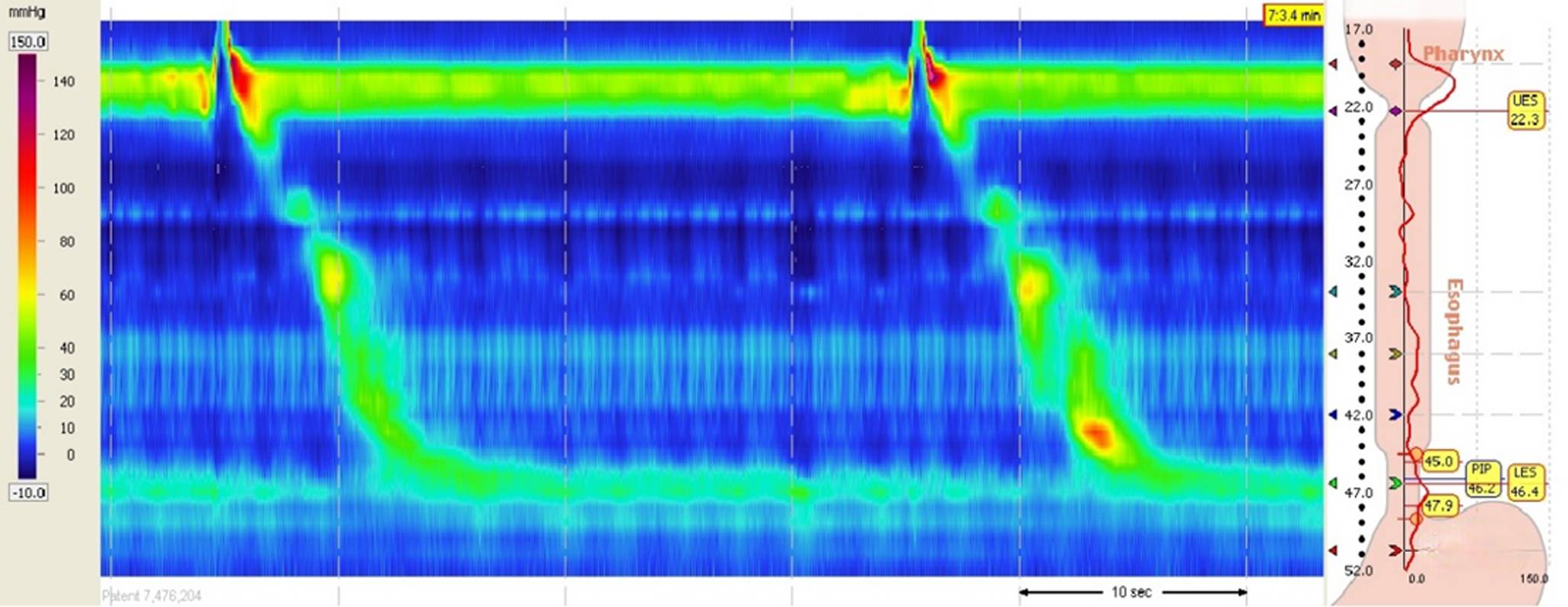 ManoView recording. Impedance and pressure were recorded from the pharynx to the stomach. Time was shown on the X‑axis, and location was shown on the Y‑axis. Red represented high pressure, and blue represented low pressure