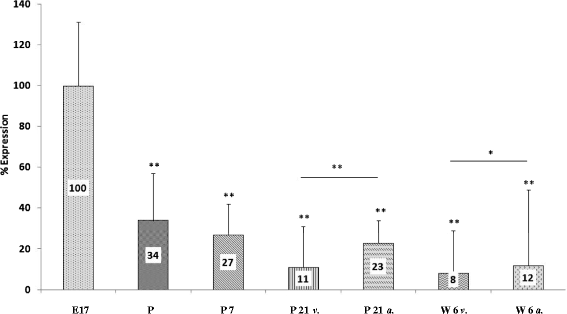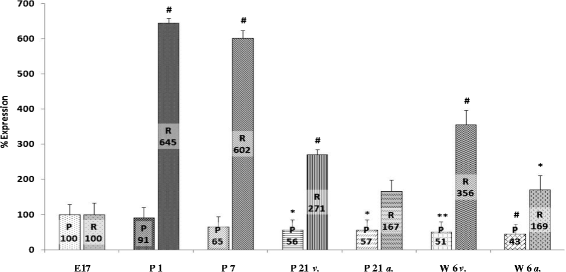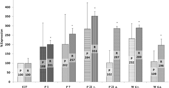 Results are expressed as mean percent change of mRNA expression or protein amount ± standard deviation (SD) compared to developmental stage E17 set at 100%. Statistical analysis was performed using one-way analysis of variance (ANOVA). Significance of differences was established using a Tukey’s test for post hoc comparisons. All statistical analysis was performed using GraphPad Prism version 4.00 software (GraphPad Software Inc., La Jolla, CA, USA). p values <0.05 were considered to be significant, and p values <0.001 were assumed to be highly significant.