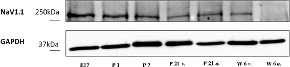 13] demonstrating a similar developmental SCN8A RNA expression pattern in mouse myocardium. In the present study, however, we were not able to detect SCN8A protein by means of Western blot analysis. This finding may be due to very small amounts of protein in cardiomyocytes. In order to rule out a methodical error resulting in failure of SCN8A protein detection in the developing rat myocardium by Western blot, we were able to quantify the expression of SCN8A protein from brain samples with an identical experimental setup (Figure